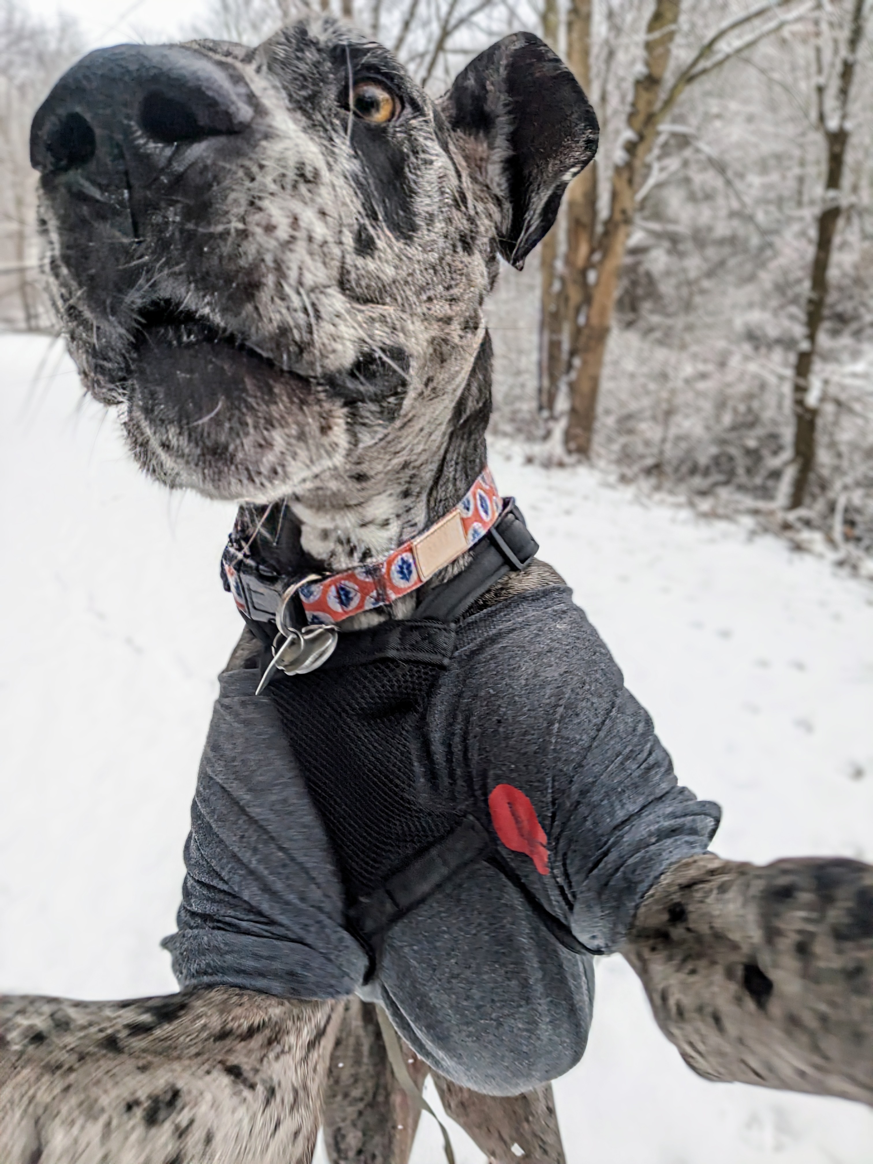 Beau was his cute and silly self on our adventure today. We started off by waving to his friends, the neighborhood dogs. Then we played in the snow and explored a bit. In the middle of our walk. Beau decided
