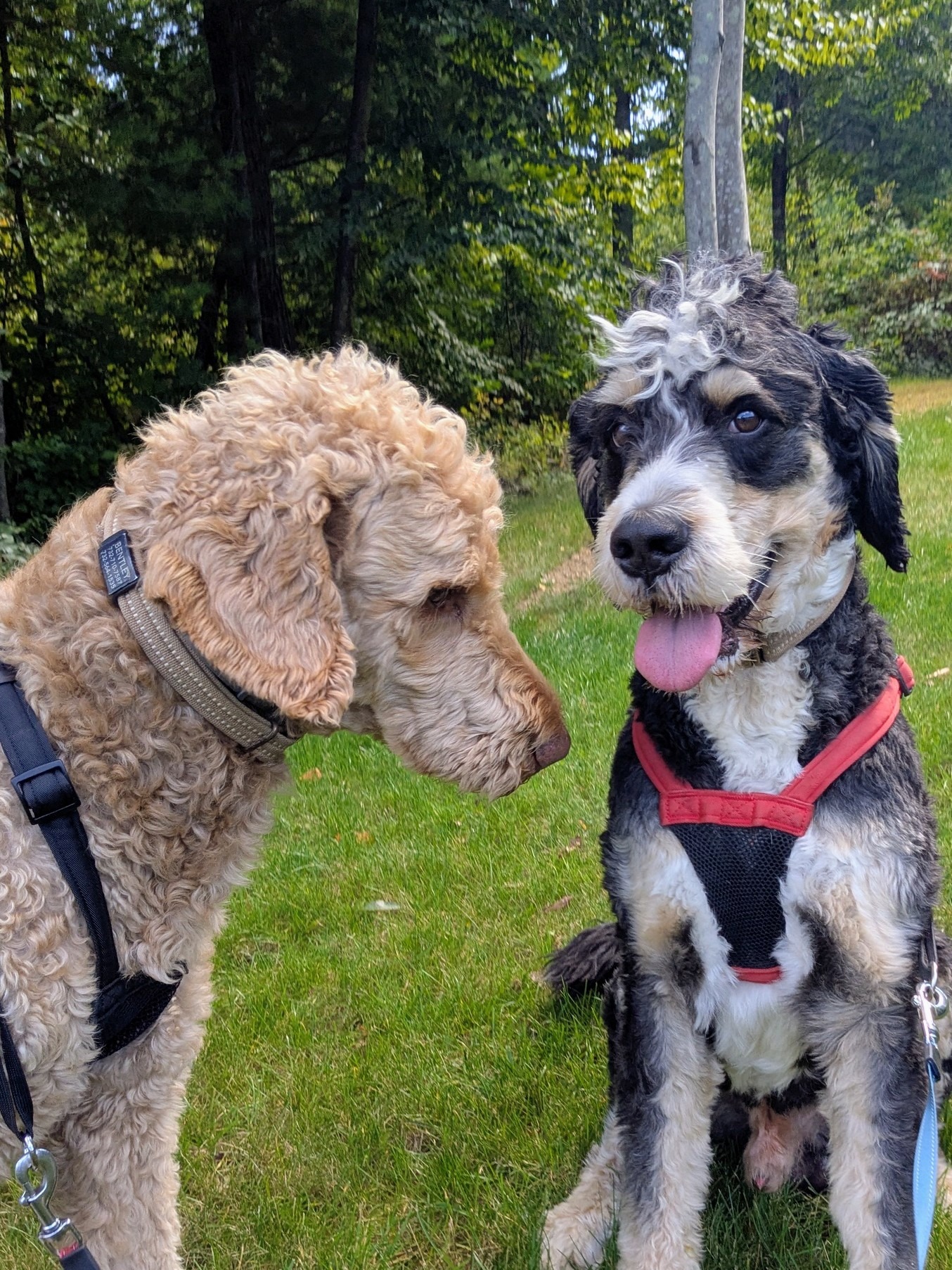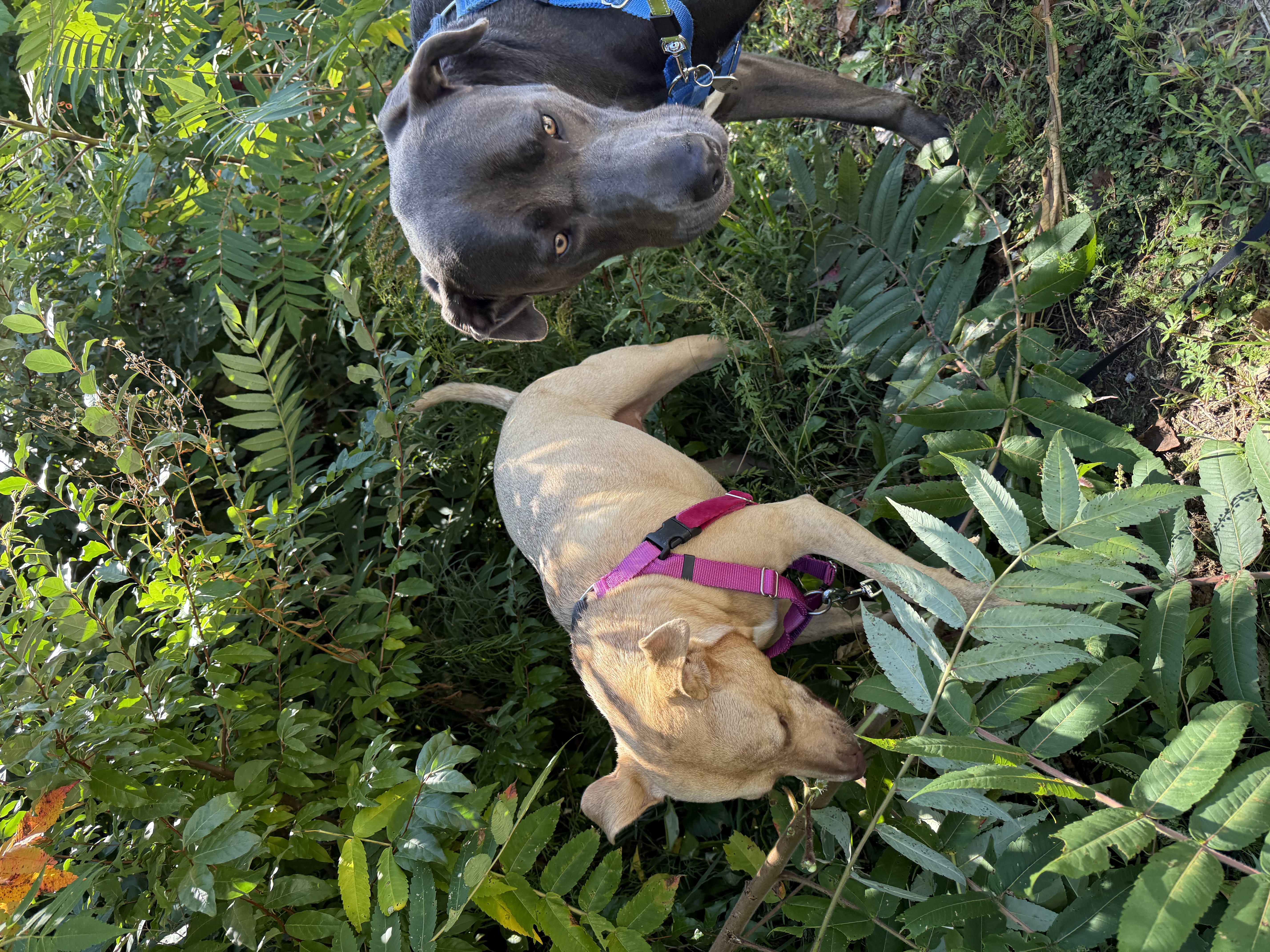 Millie had a great walk today. To start off the weather is beautiful today so we were both thankful for that. She ate grass, she ran, she walked, she made friends with a squirrel he ran, she dodged some acorns,