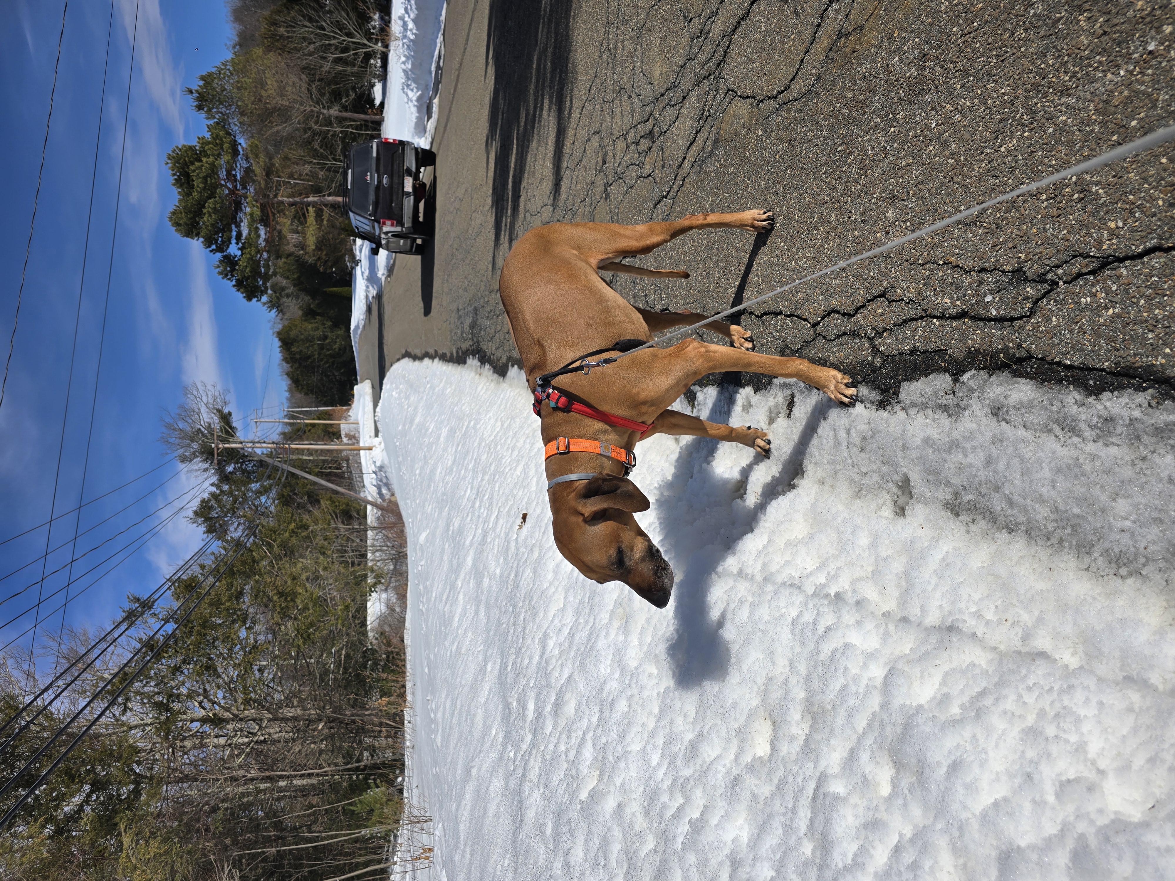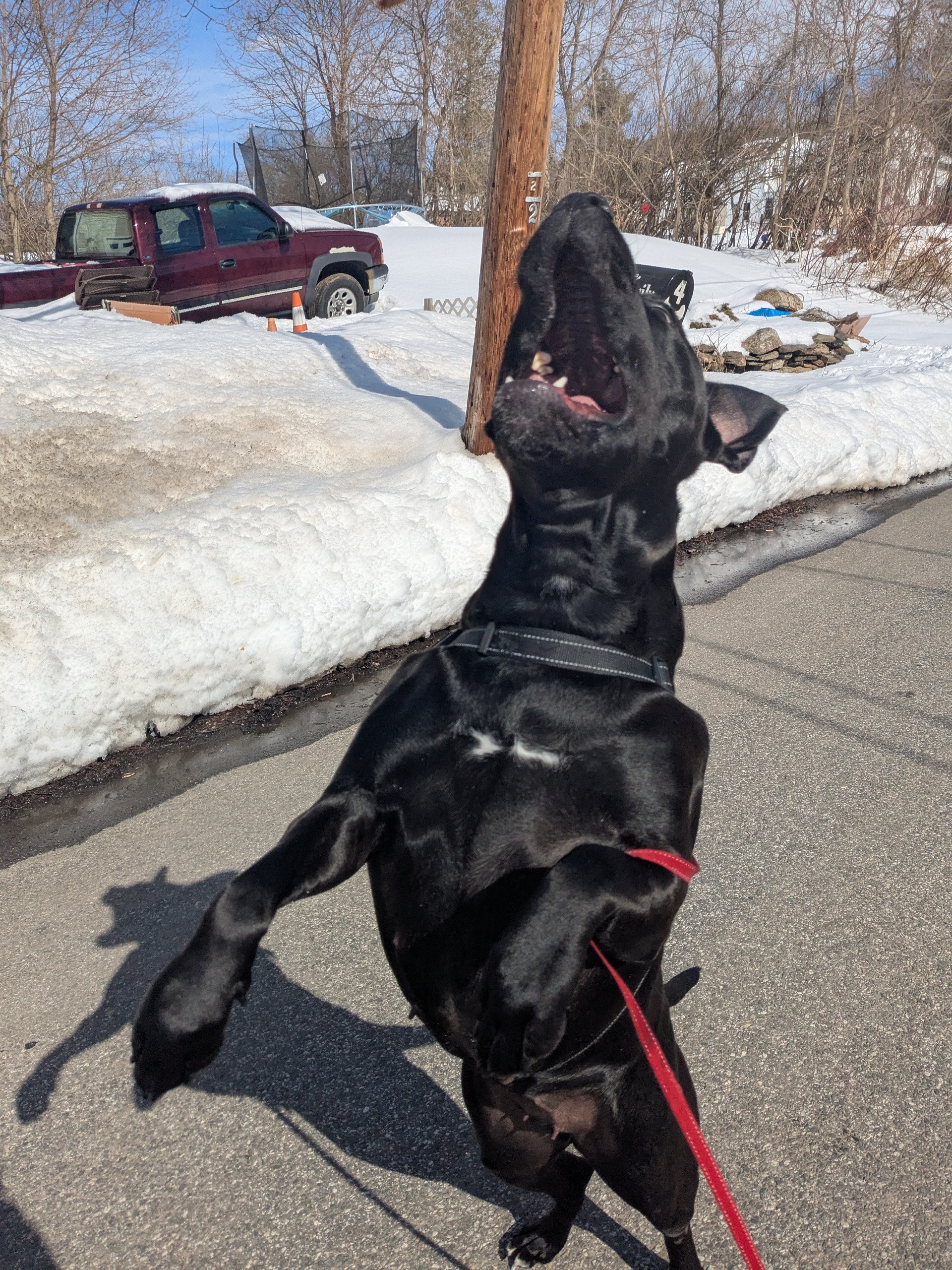 With the bag weather behind is the hang was thrilled to enjoy some sunshine and warmth today. Jada was happy and silly, plowing through remaining snow drifts before they all melted. Gus was great, except for a bit of a