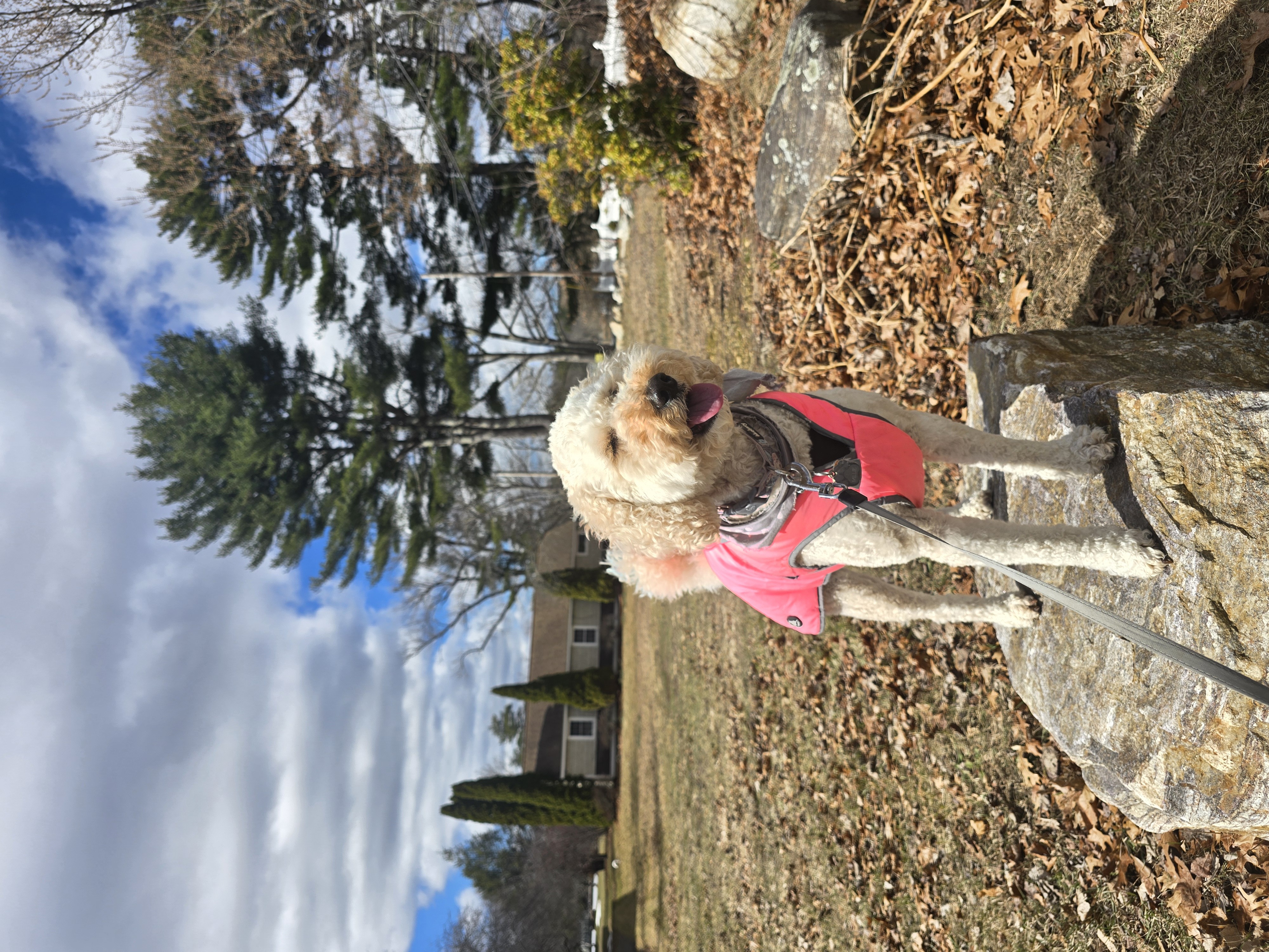 Today weather was suprising but not shocking. Today was a mix of big wind gust and some sunshine! Willow was a bit over whelmed at first because of all the leaves and sticks blowing around but treats can make anyone