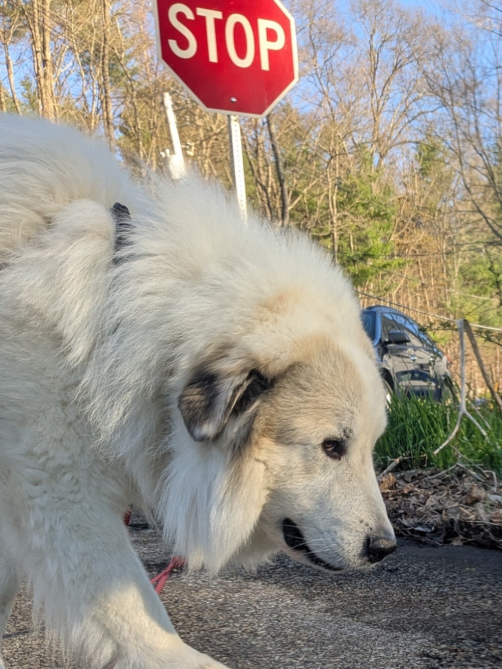 When you take care of dogs, sometimes it’s necessary to take quick action to correct their behavior. For example, on this morning’s walk, anetto spied a truck making those diesel sounds. He likes so much. He said, hey, watch me