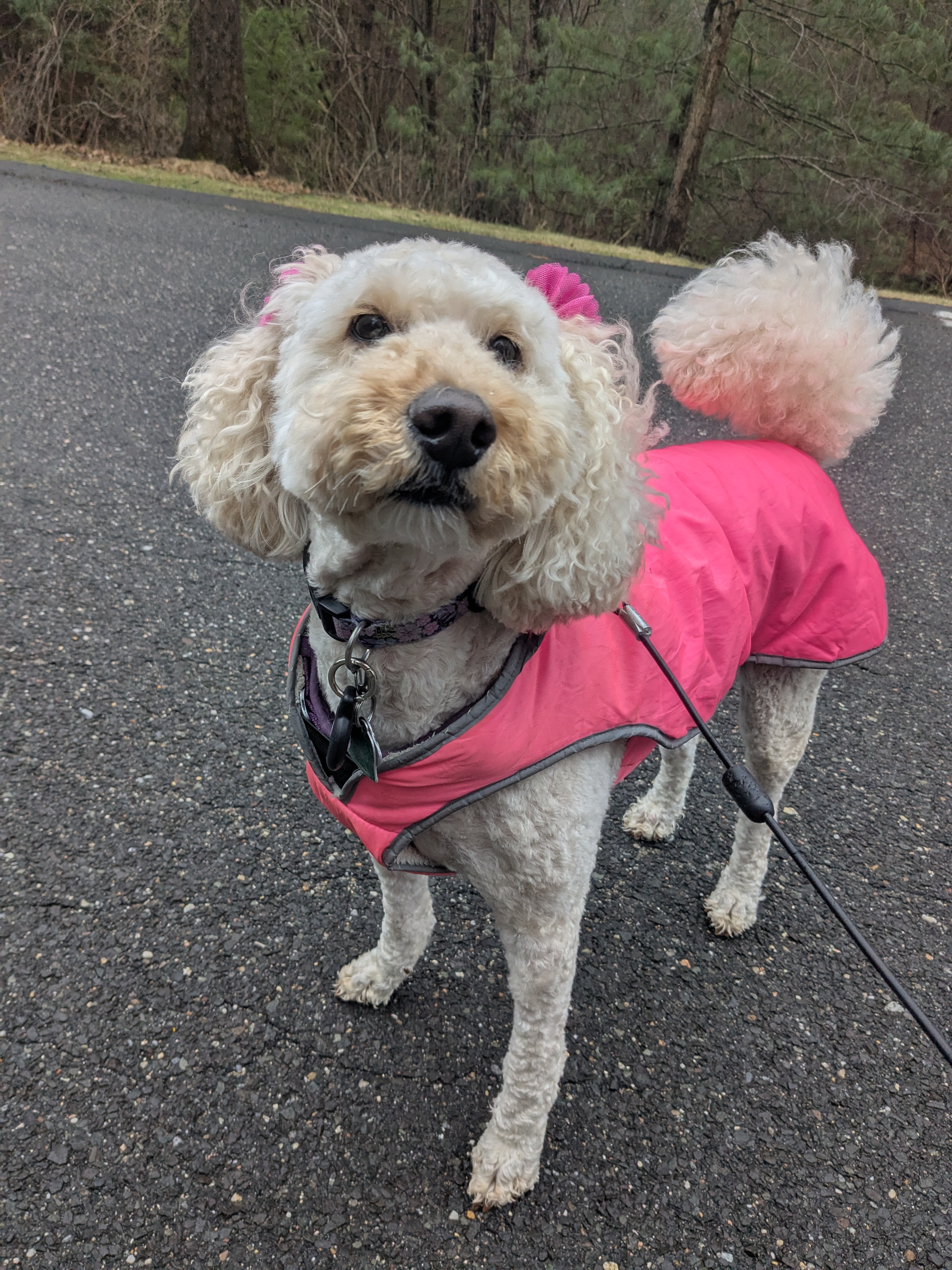 When I saw Millie in the window with her cute pink bows, my heart melted! I know I was in for a treat when I opened the door to see her spring make over! I was not disappointed! She looked adorable and her tail was extra floofy!♥️. It is cold and rainy so a coat is a must and how perfect that it too is pink! She told me she wanted to do a little photo shoot to show all her furiends how pretty she look before played in the mud puddles! So I snapped a few and off she went in every single puddle we passed! 🤦🤣. When we were done with our walk and she felt she wasn’t dirty enough, she proceeded to have the zoomies in her yard, kicking up mud and making divots in the grass with her mouth! So she may look like a girlie girl all pretty in pink but she is not afraid to get her paws dirty! My true spirit animal! 🩷♥️🩷♥️