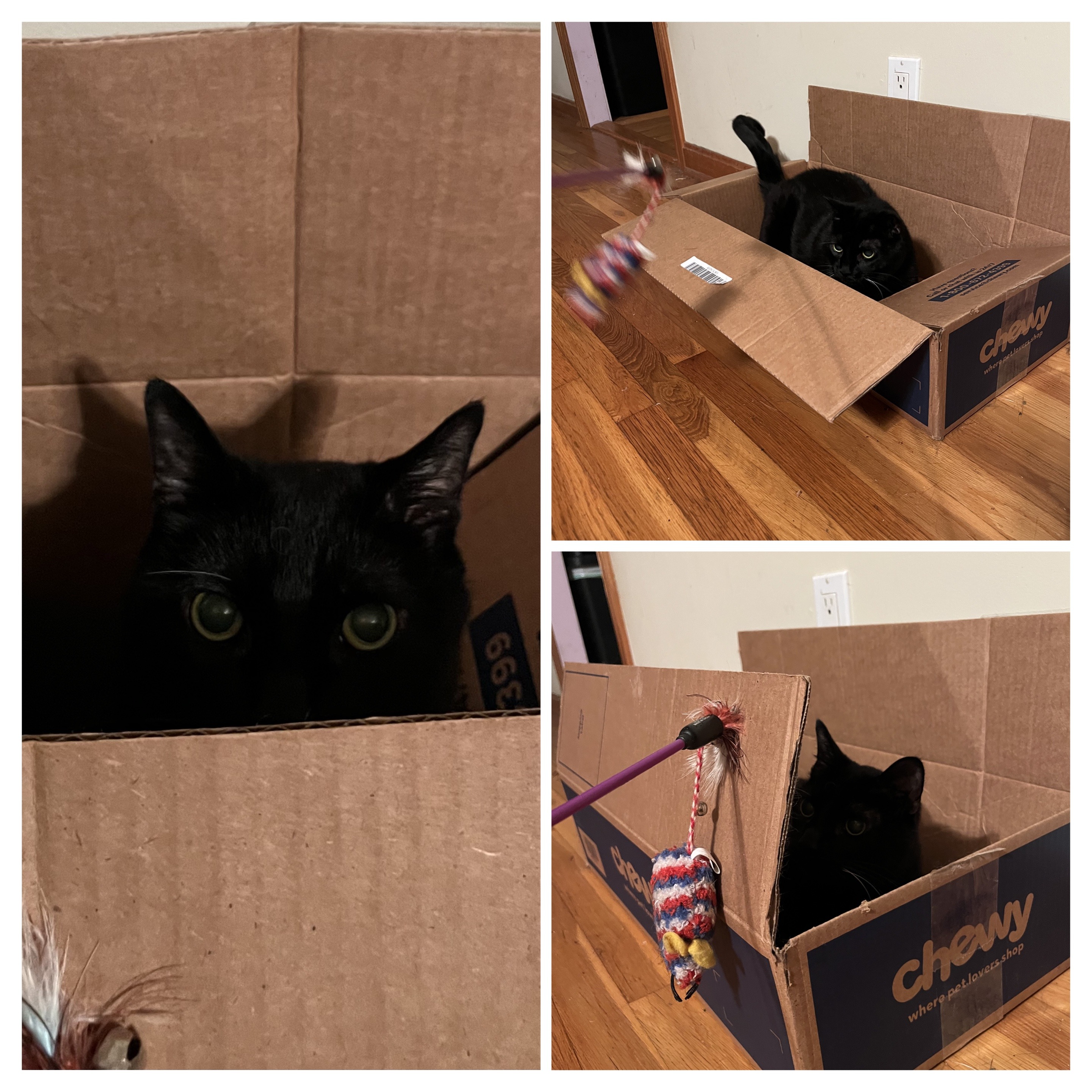 I have to say this so the first time I was hanging with the same pet for a thunderstorm. Cash & I spent time playing after dinner and he was poking his head out of the the box again 😂 then doing this half way stare which made me think it could be a meme lol! Once he was done playing he sprawled out on the floor and was purring away with his head scratches.