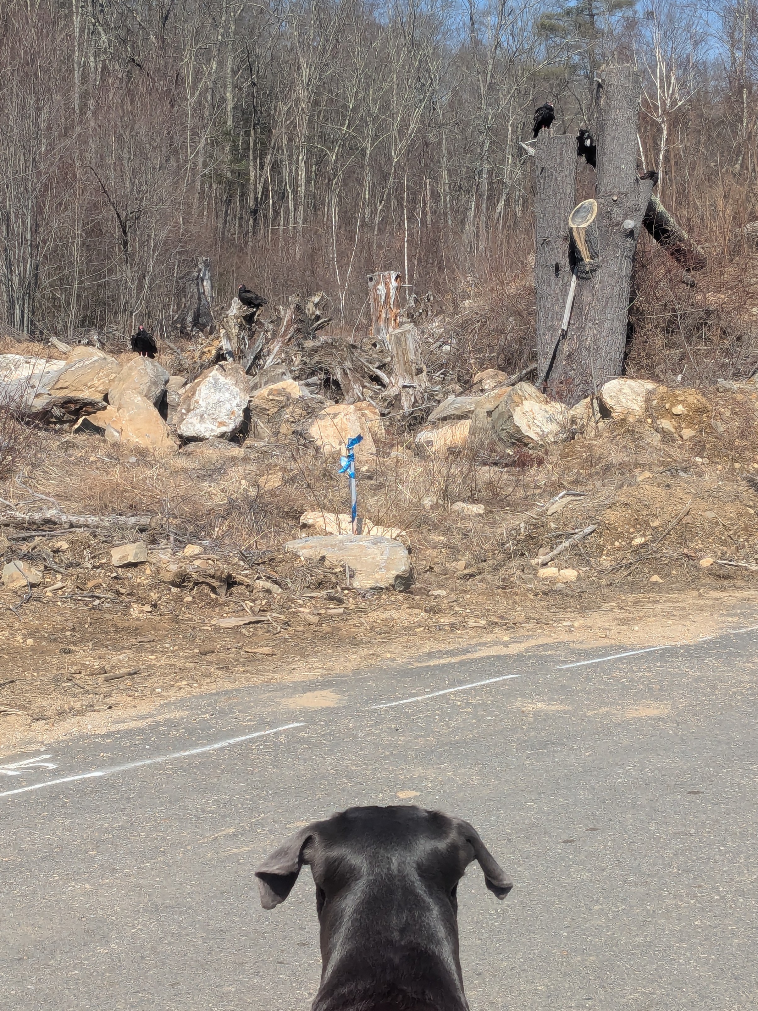Well today we got to see some cool feathered friends from a far. I didn’t notice the flock of turkey vultures on the old tree but Ollie did and stopped dead in his tracks. Lucy soon did too. So we observed them for a little bit until I think we made them a little uneasy and few flew off the tree and circled us. Part of me thought they were going to swoop down and attack us but nope, they were just checking us out as well. After that excitement Lucy found a big ole stick to carry along on the rest of our walk. It was a fun and exciting walkies!