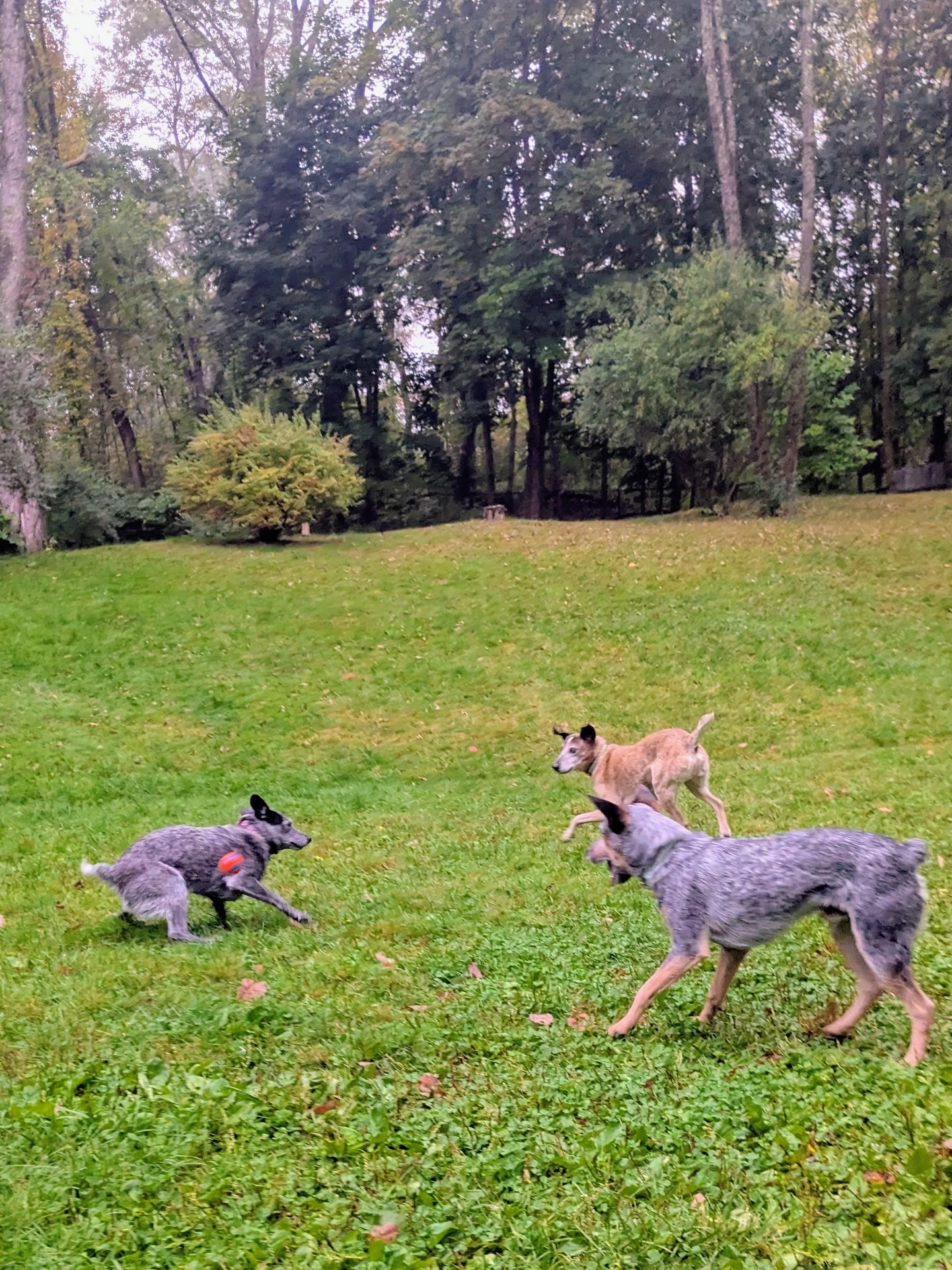 The gang welcomed me back with yips and leaps and wagging hips. Even the kitties swung by to give me nods. It was already late and they nestled around me like little ducklings while I worked the laptop. I woke up in the middle of the night with 2 dogs and a cat on me because someone needed to go potty. Or maybe everybody. We snuck out in the dark like campers after hours, giggling. Maybe that’s why everyone slept in until 8 this morning. 😊 Well rested and we’ll fed we charged out for our morning exercise. Judging by the way they chased those balls you’d think I gave them Wheaties instead of kibble! 🥰