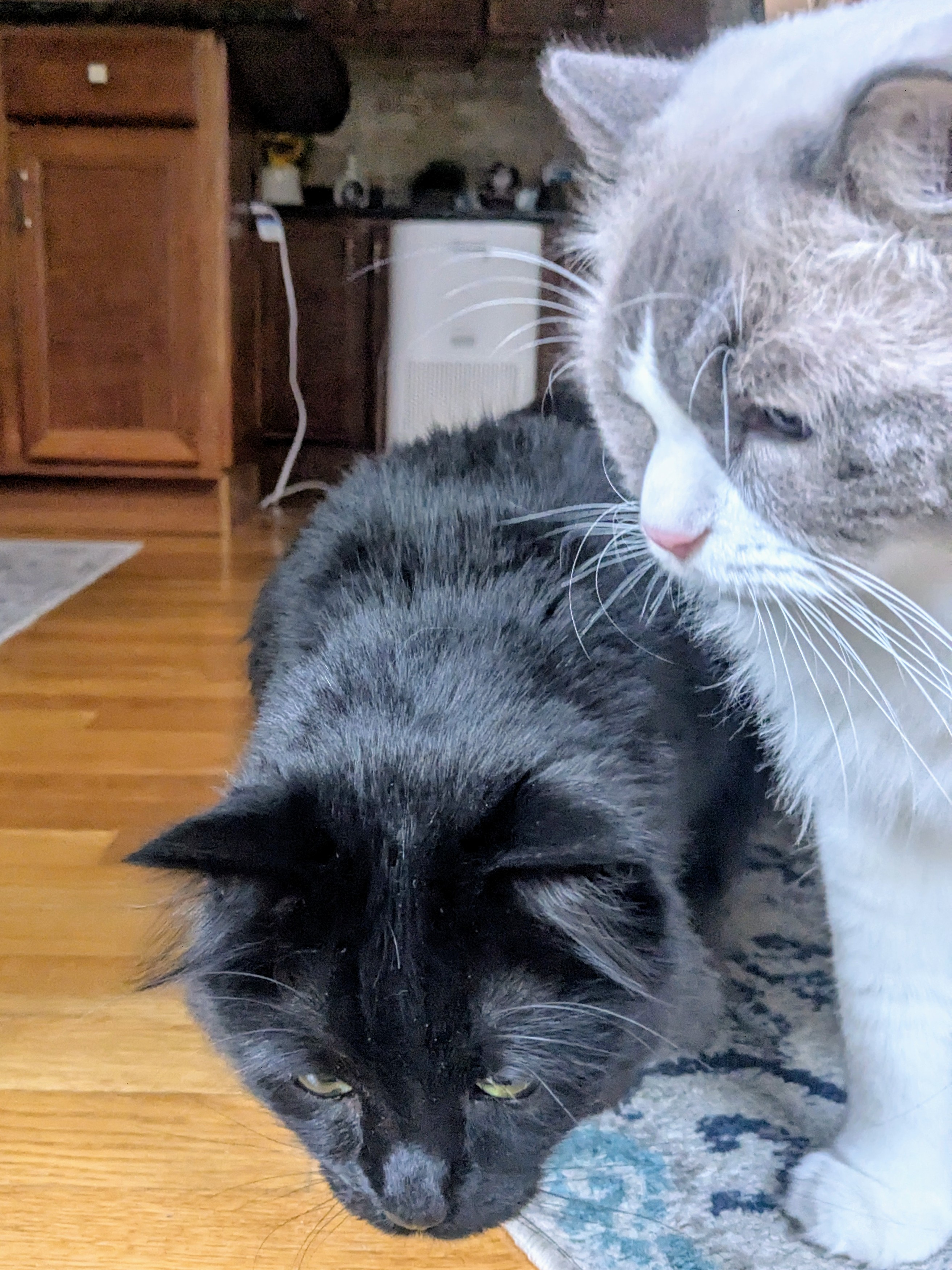 Nice morning visit with the kids. I spent extra time with Elvis before breakfast since that’s the only time he’s interested. For letting me pet him I let him lick the breakfast bowl and he seemed very excited. Toby was his usual luxuriant self and I left him lounging in the sun in the living room