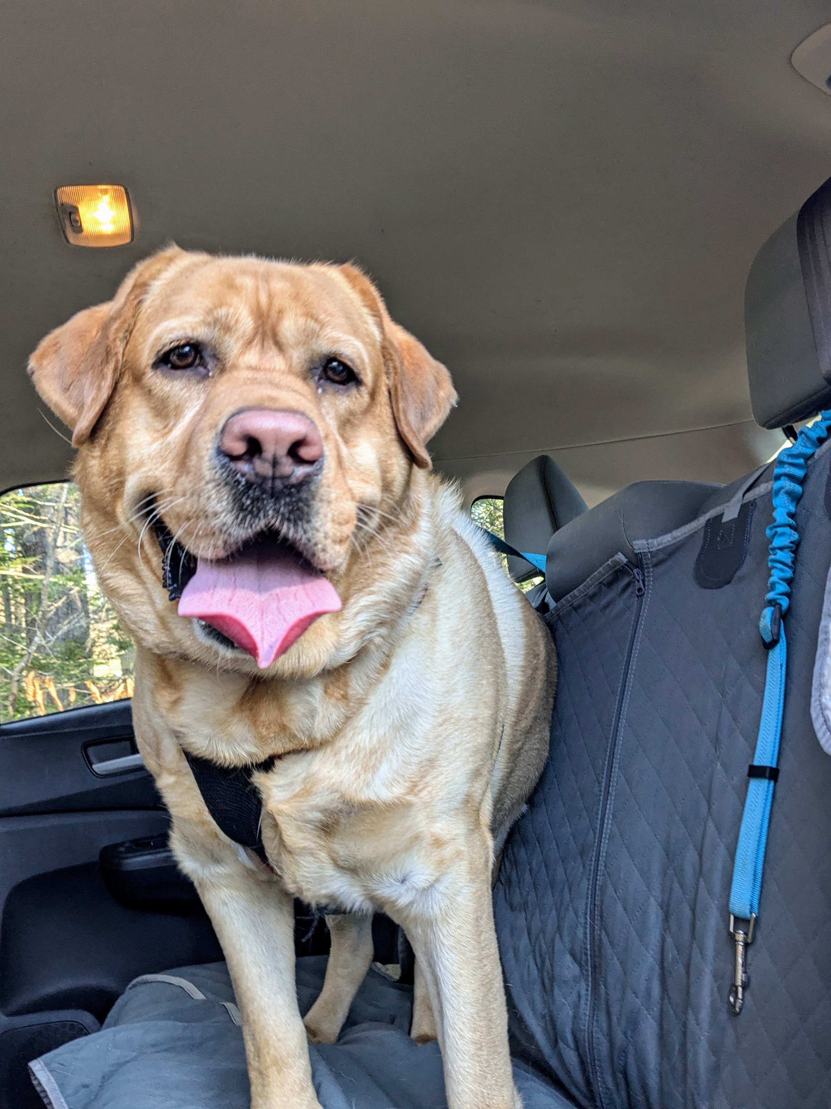 We worked on helping Charlie re-learn getting into a car. We covered the importance of giving him ample floor space to get in, using a martingale collar so he can’t just *refuse* to go, and to lead by example – getting into the car first and having him follow. We talked about the importance of a routine – putting on the collar and getting him into the car in the garage – to reduce the anxiety of getting in. We also talked about weight loss – this may be the biggest issue. Charlie needs to lose AT LEAST 40# in the near future to protect him from ACL injuries and extend his lifespan.