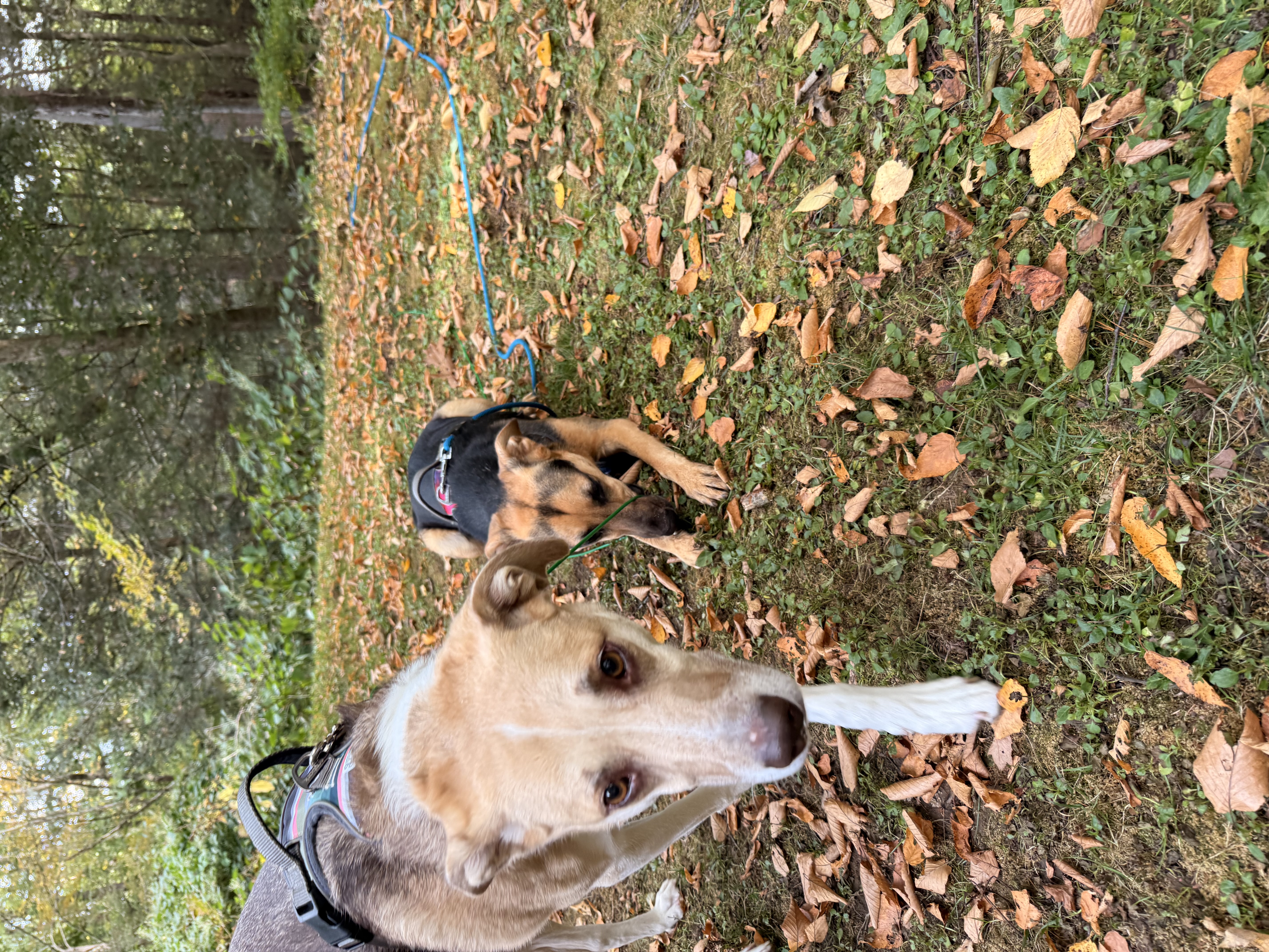 After there tangled up walk we went to the back for some yard time before heading home in. These two gorgeous girls sure know how to pose for some treats! Walking in no one really barked and they were both happy to see me. Fawn did great putting on the harness she didn’t seem to nervous. Polly is just happy to be there.