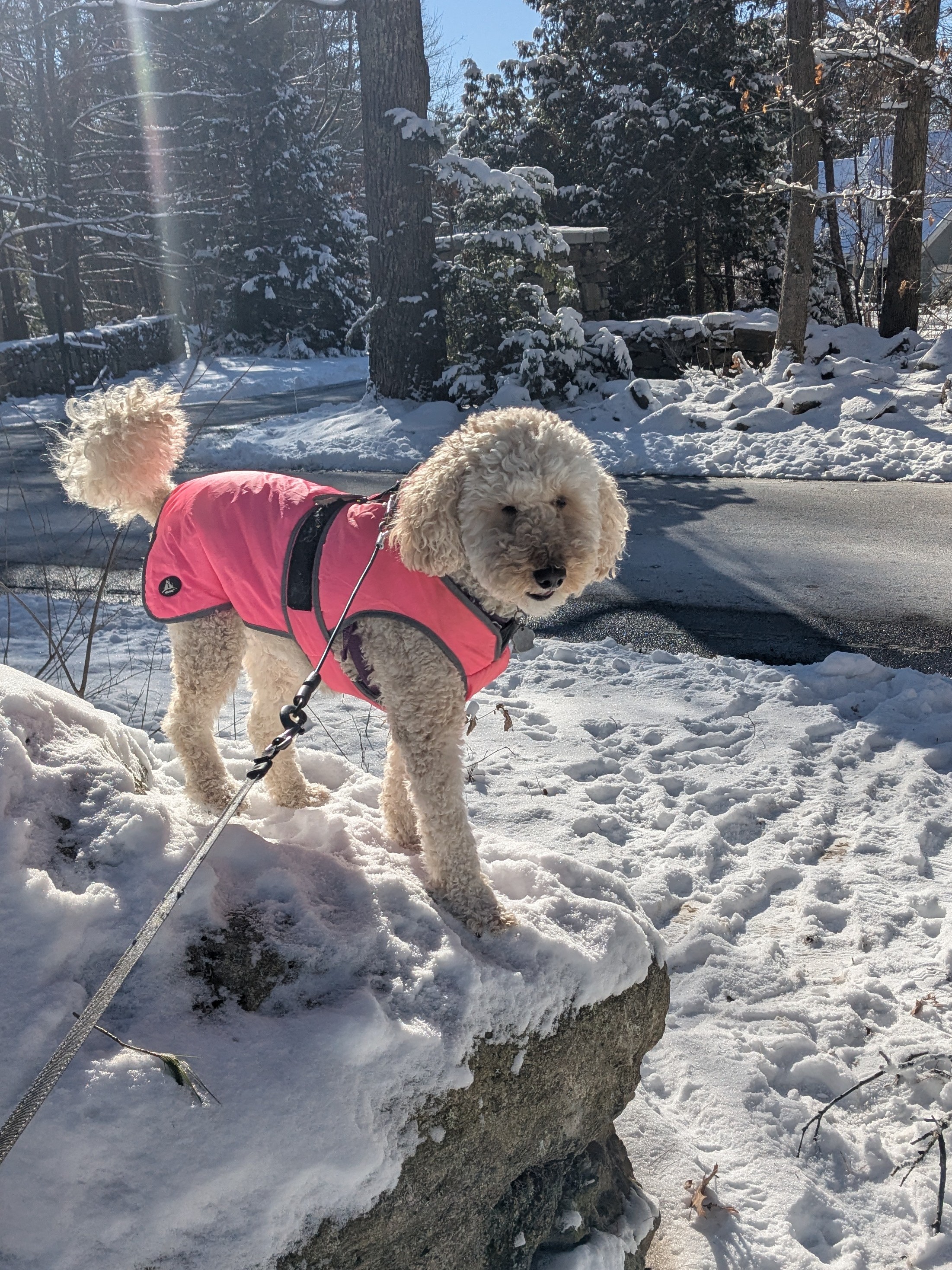 Millie and I were prepared for the Artic chill, all bundled up and full of warm hello kisses and hugs, or so we thought!🤔. We planned on a shorter walk since it was so cold and half way through our walk my fingers started to numb and Millie’s paws too. We had to stop a few times to warm them up. That absolutely didn’t stop us from having fun! Millie decided what better way to warm her frosty paws than to practice her parkour skills by sprinting towards me and flipping off my warm legs and core!😆 then we would play tag to keep our blood flowing until we got back to the yard where we still played for bit in the snow because that is what we love to do together but just a minute or two since we needed to get warm. So basically our walk was a normal walk but in fast motion! 🤣