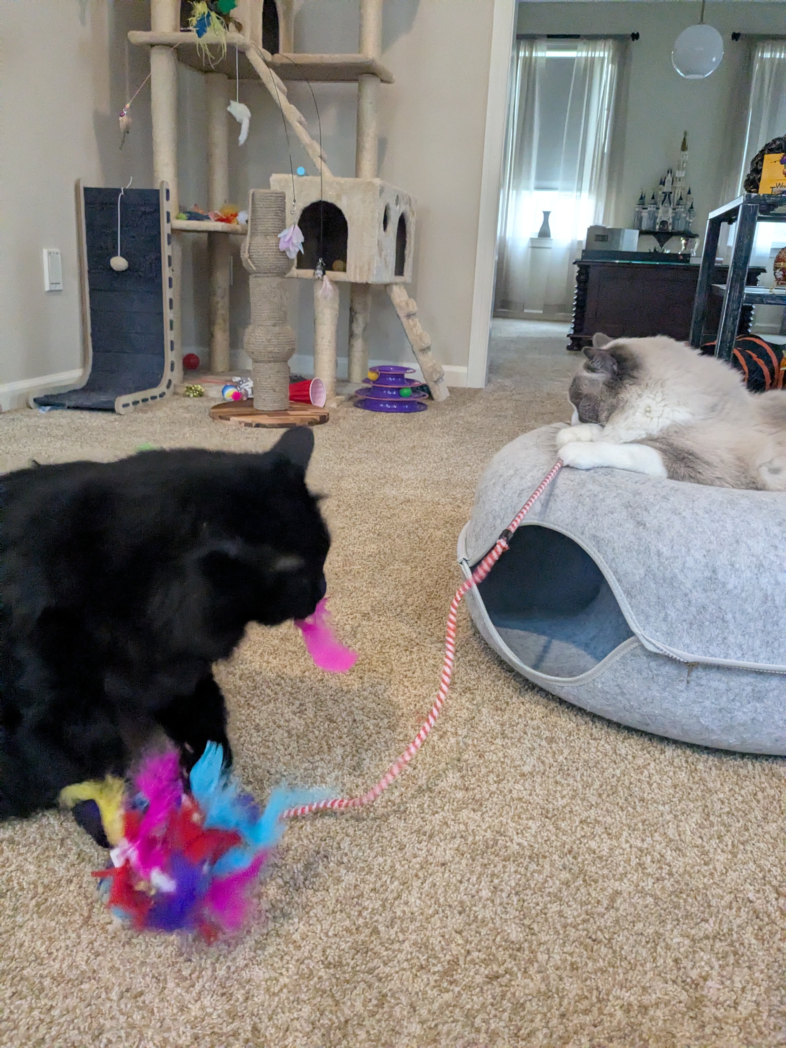The Boyz were in the mood for some feather wand with a side of catnip fun tonight! Toby and Elvis got so silly from the catnip that every toy became their favorite and at one point , they had to share the wand! Elvis attacked the feathers while Toby in the comfort of his favorite spot, (I call it a bagel bed cave) held onto the handle! It was hysterical. They sure know how to have fun and I am so grateful I can be a part of it! 😻🤣❤️