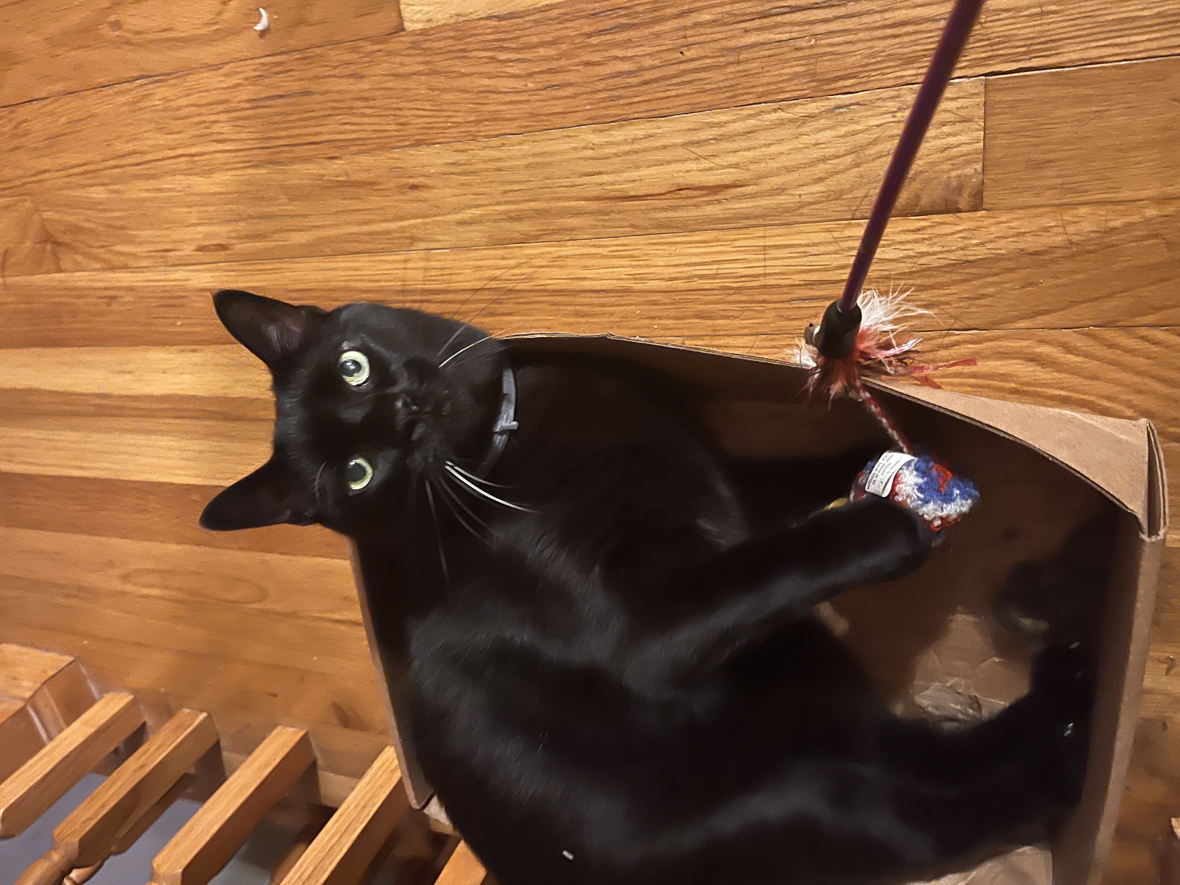 As always a great visit with the coolest cat around ! Gave him his medicine while he ate. Then he plopped down on the floor to relax. After some relax time we got to his favorite game of hunt & pounce. He was REALLY into the game and had me cracking up ! I let him enjoy winning a few times before he laid in his box and gave me the “ I’m done “ look 😹.
