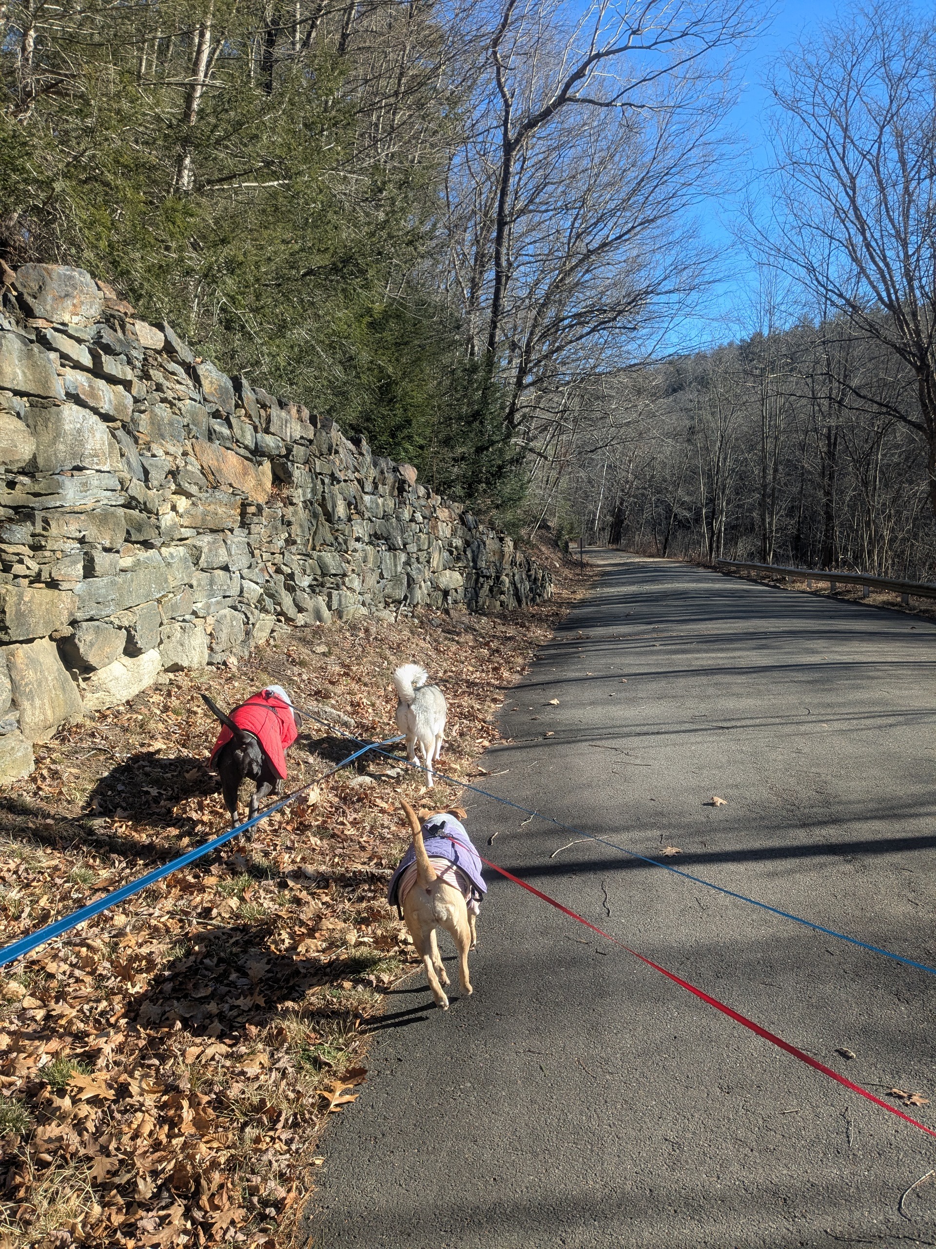 Packer sat patiently, waiting for the rest of the motley crew to arrive, but inside he was jumping out of his pants. Oliver and Lucy poured out of their limo, dressed bad to the bone in their new winter jackets. Their reunions are epic, and as entertaining as a concert. Oliver went to sniff at some stones while Packer found a wall he wanted to climb and leap off. 😊Lucy raced between the two princes unsure which offered the most fun. Together the trio put on quite a show, and their love for each other left me feeling like it was a wonderful world after all. 🥰