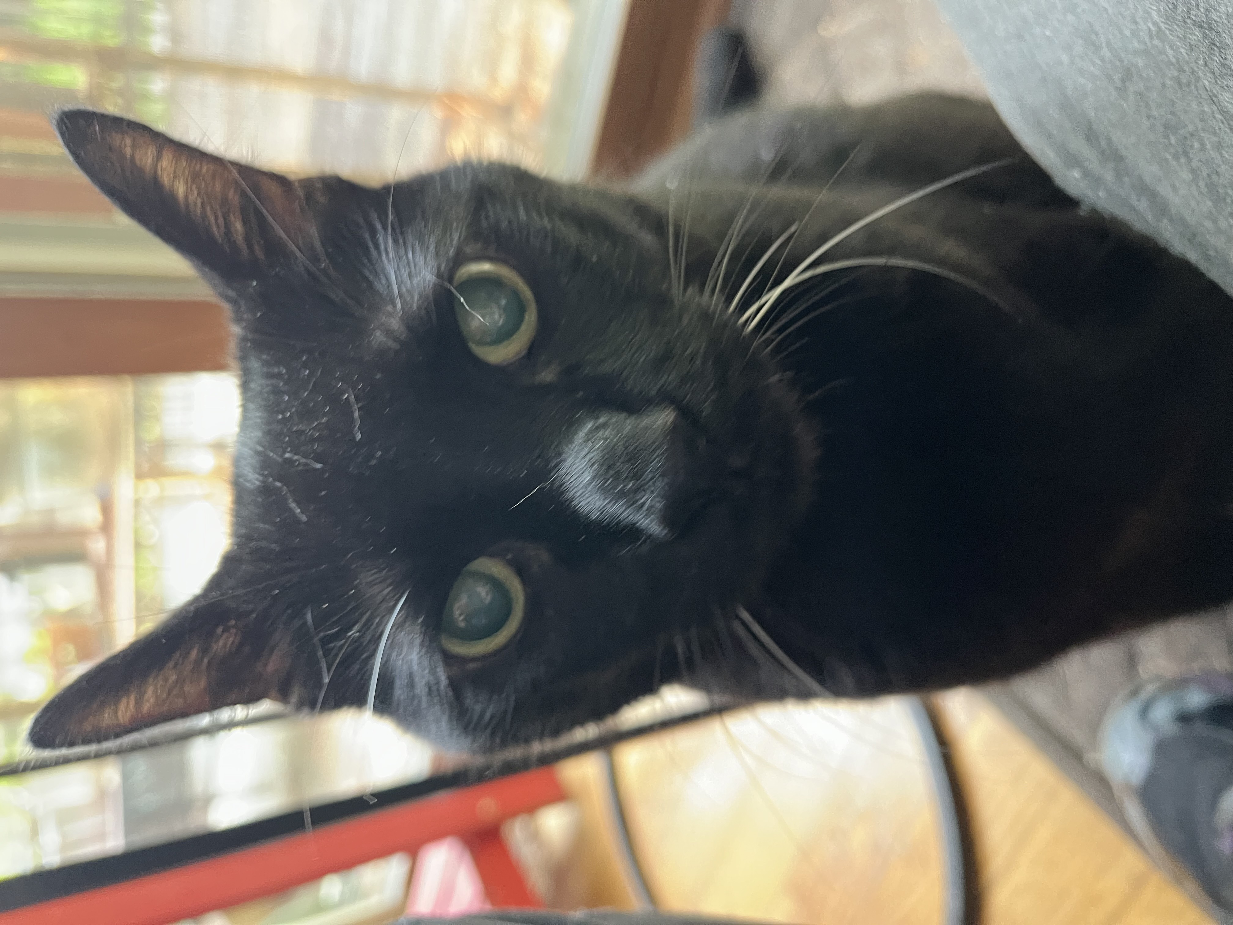 This morning we sat in front of slider and embraced the morning calmness. First time he practically sat in my lap but he seemed to enjoy sniffing me ,since I smelled like a pack of dogs, cats, & chickens