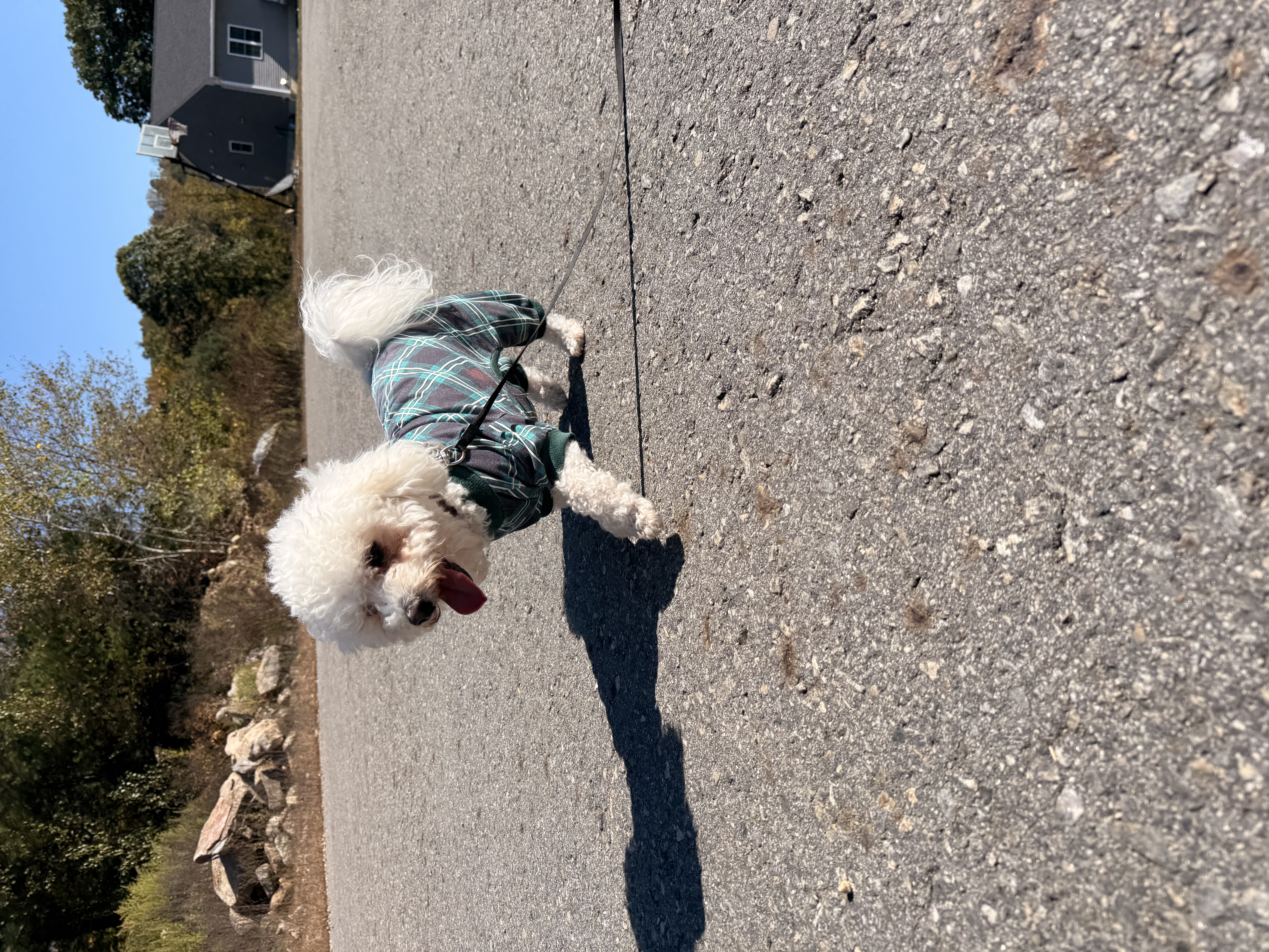 Today mylo was wearing his business man pjs searching the street making sure there no coyotes! Mylo must have scared them away we heard a bit of wresting in the woods and decided to walk a little faster then normal. We still had time for treats and pets on the porch! The weather kicked in fast today Mylo definitely drank lots of water when he got inside. ☀️😆