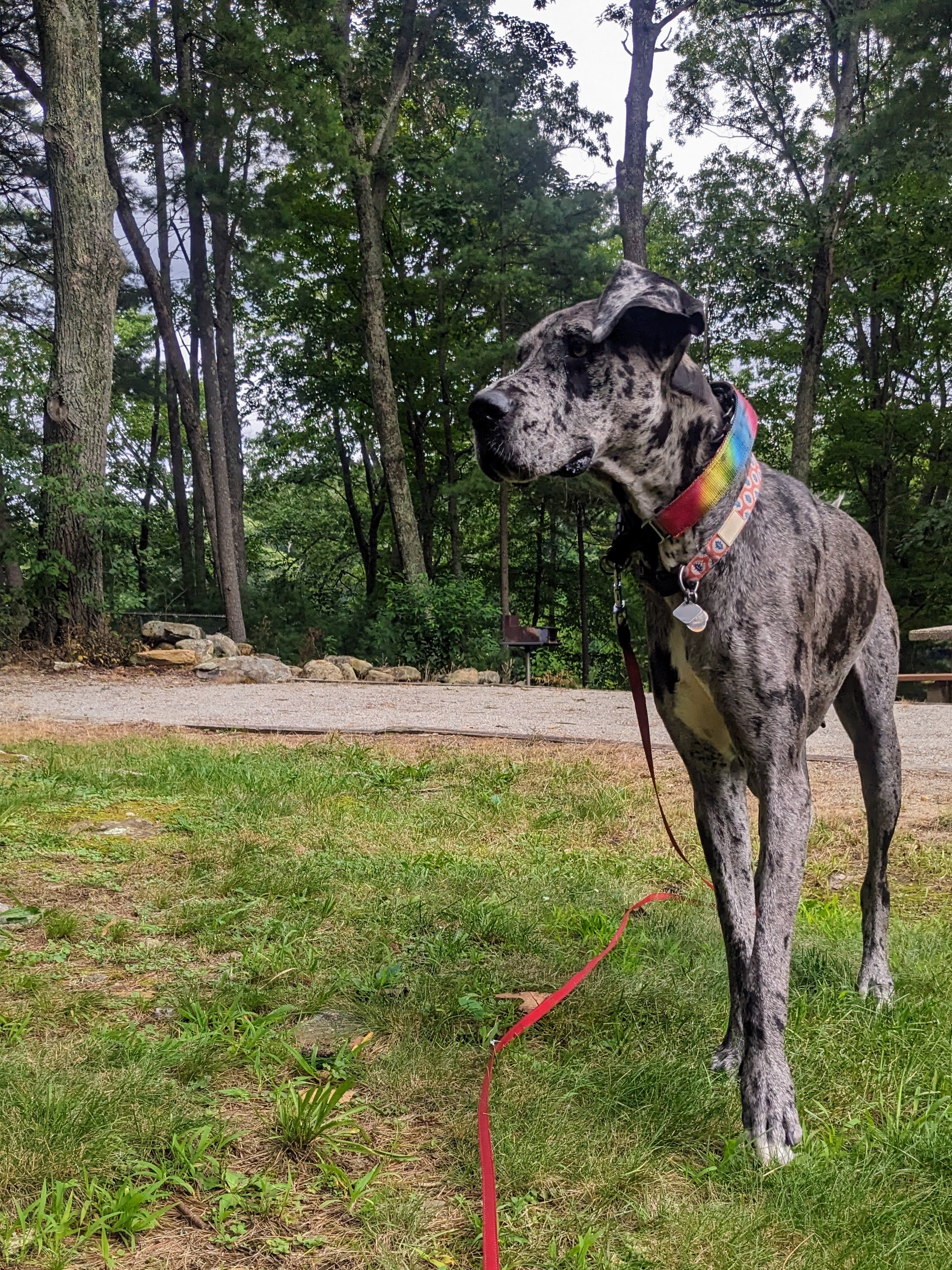 It was a wonderful walk along the trail – cool, not crowded, and we chose a path off the beaten track to keep things fresh. Koda loved sticking her nose into every bush, blade of grass, and picnic bench along the way. We did end up passing some people and dogs. Koda was kind and respectful to all, and they commented on how beautiful and well behaved she is. She was the best of the dogs, trotting along while they pulled and barked. And when a tiny yorkie got all barky and aggressive with her, Koda just didn’t know what to do. She lay down in friendship, wagging her tail, but the yorkie kept barking and threatening. And Koda let out the tiniest growl, barely a hiccup, and this yorkie became silent and skittered off so fast… Koda’s restraint and self-control was marvelous, and even the yorkie’s mom was impressed.