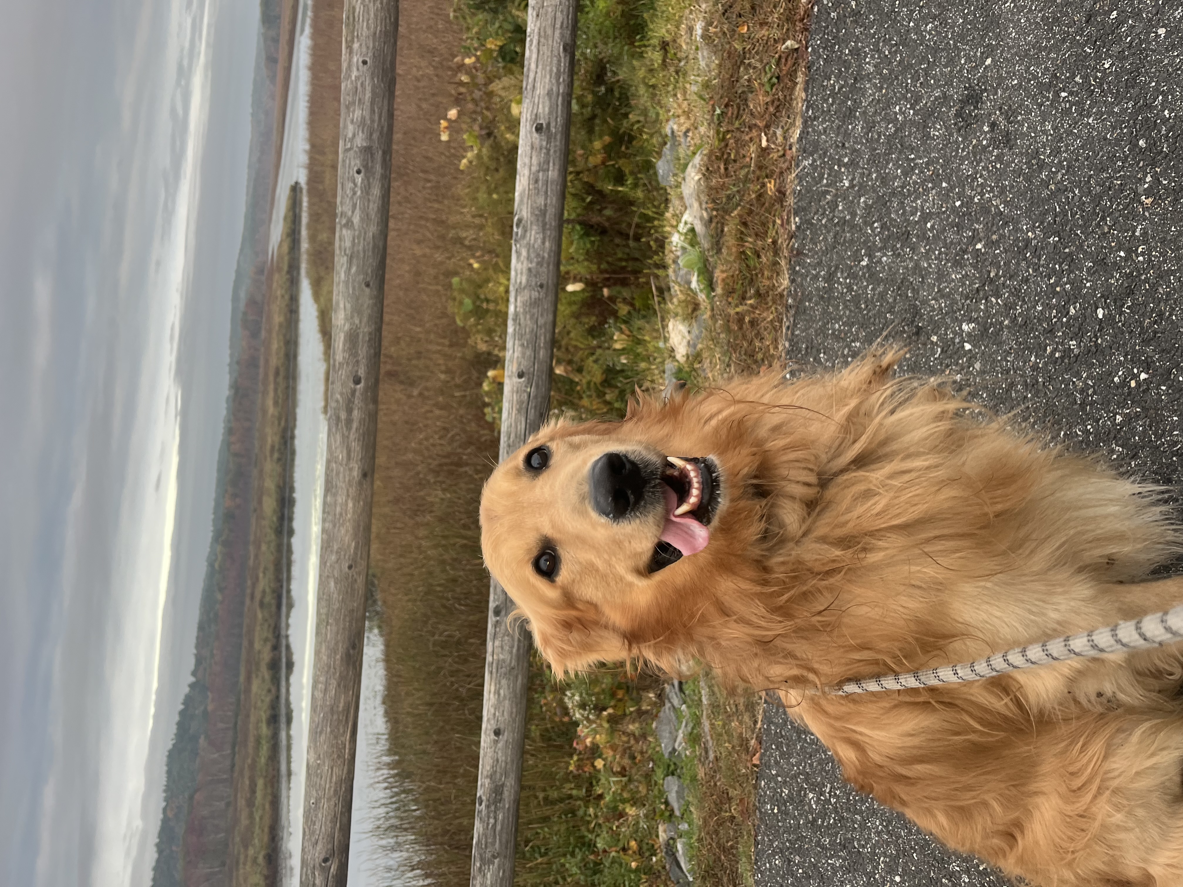 I decided we would go by the river for our last morning stroll. He seemed to enjoy the new scents however , he poked his head & floof to sniff and got those micro furry things stuck on him .