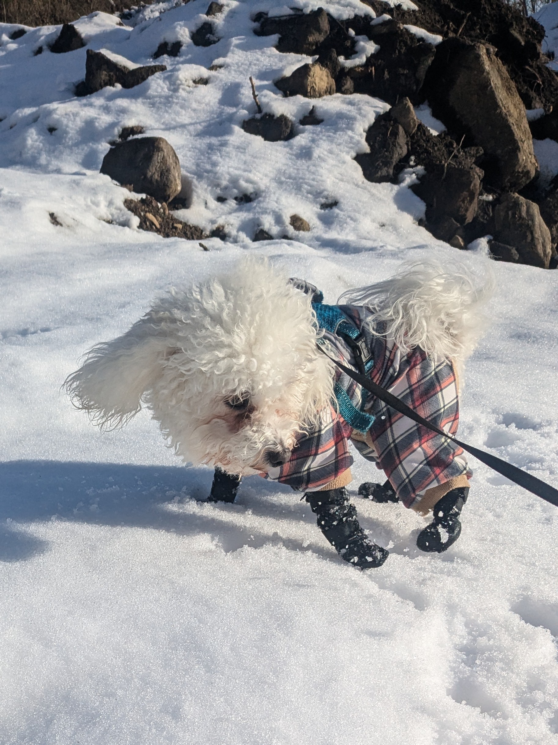 Not only did we have beautiful sunshine on our walk but we got to walk with his friends Oliver and Lucy for part of it. We played and frolicked in the snow and did lots of sniffing and exploring. Mylo also showed me how he loves to make snow angels! He had me smiling ear to ear watching him roll around in the frosty snow. 😁 We are supposed to have rain later today for our afternoon walk but Mylo will brighten up the afternoon with him just being Mylo!❤️🐾