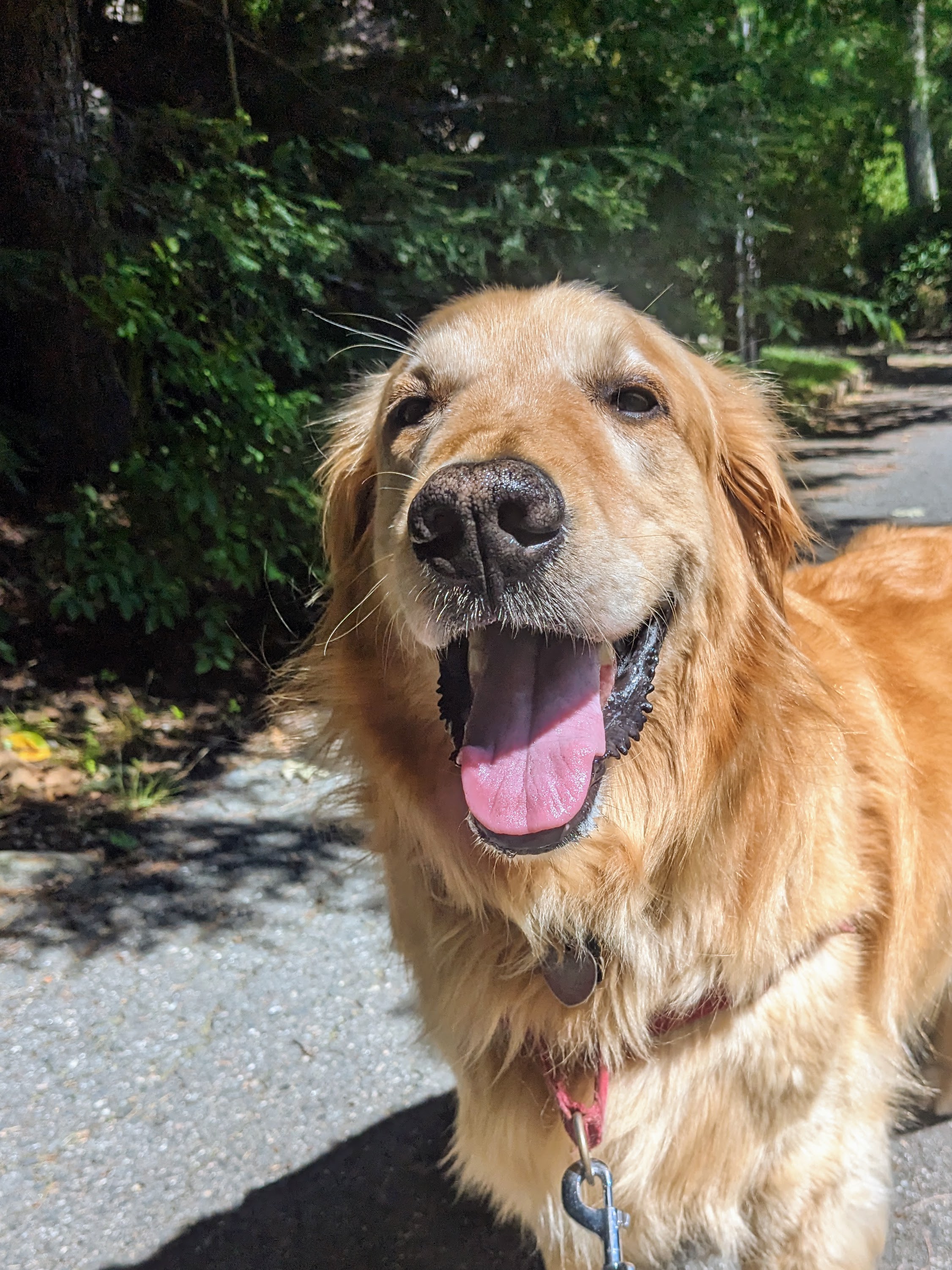 We had barely gotten on the road when we heard barking behind us – the two big cul-de-sac dogs! Julian of course returned in kind, so we hurried ahead of them to put some distance between us. We left them behind us but we must have set a very hurried pace because we were long past our normal turnaround point before it was time. Of course Julian was in a hurry to get home as always so we made great time the other way as well.