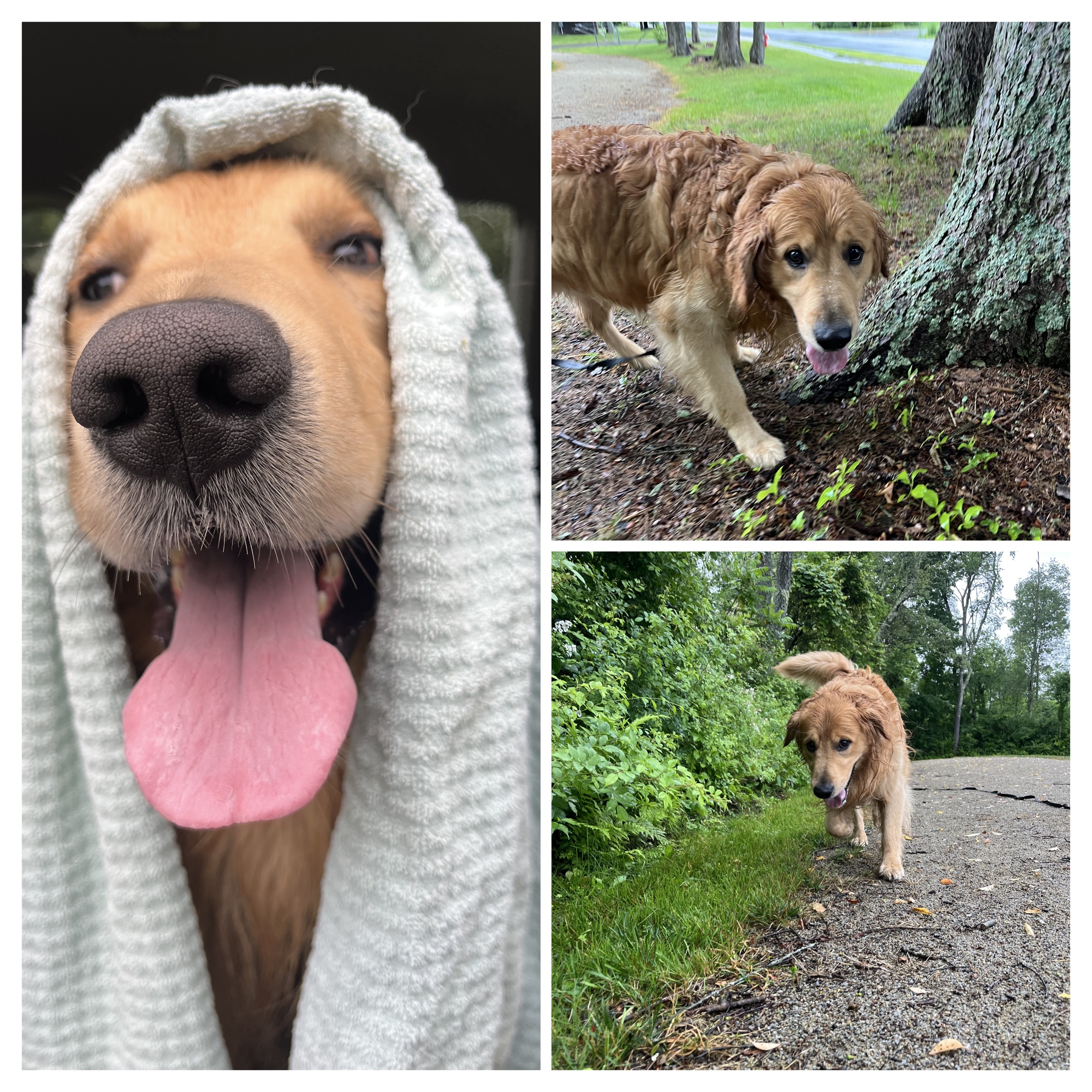 We enjoyed our soggy walk ! Always nice talking to you guys and even better when Maxwell demands I stare at him and hold his paw .