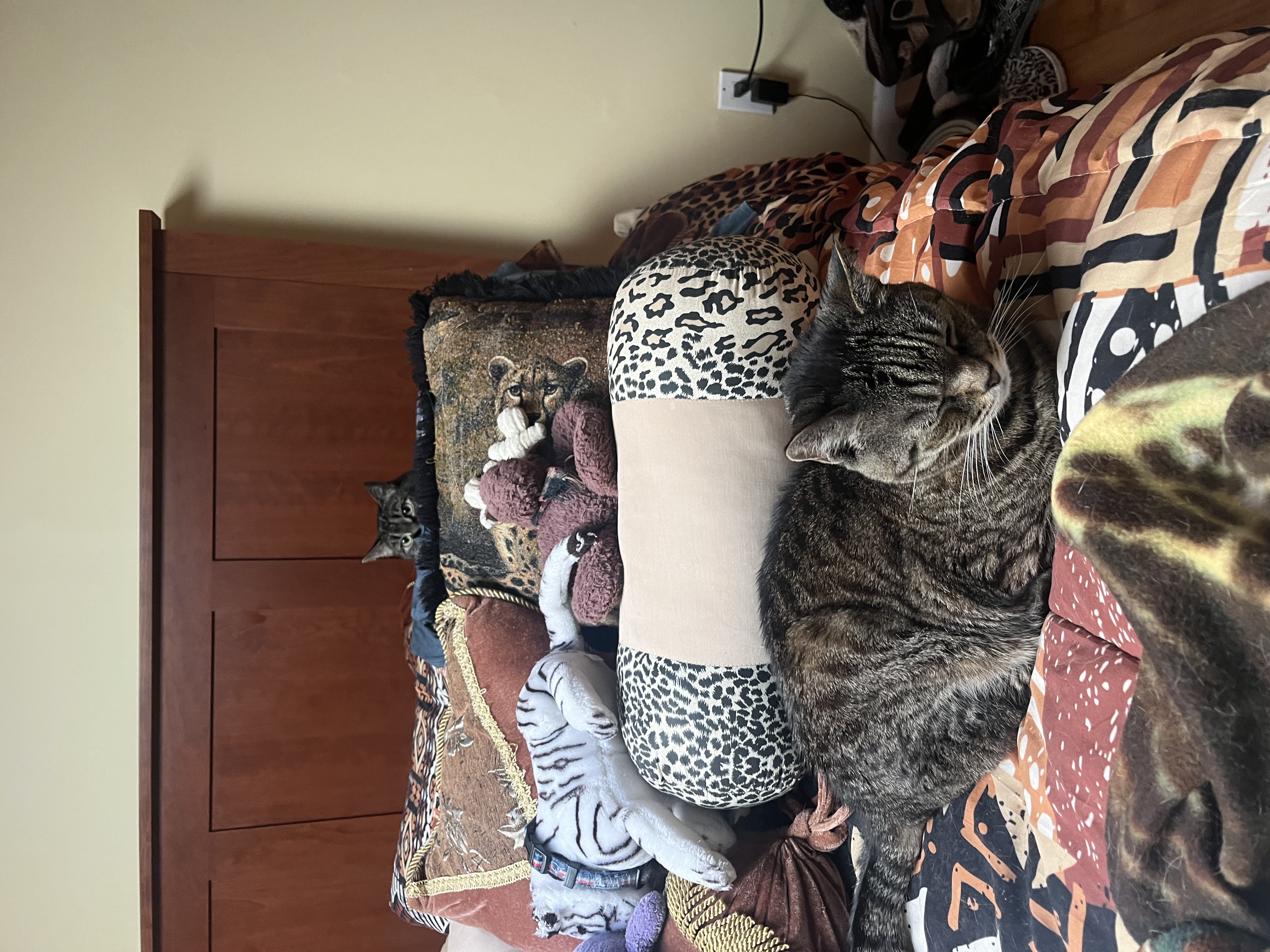Coach showed me how talented he is and that he can go on top of the cat tree. Gracie just got done working out 😆 so she was ready to eat. Jake got his head scratches before Maddie came in to steal his time then they had a double the fun playing together on the bed with the flirt pole.