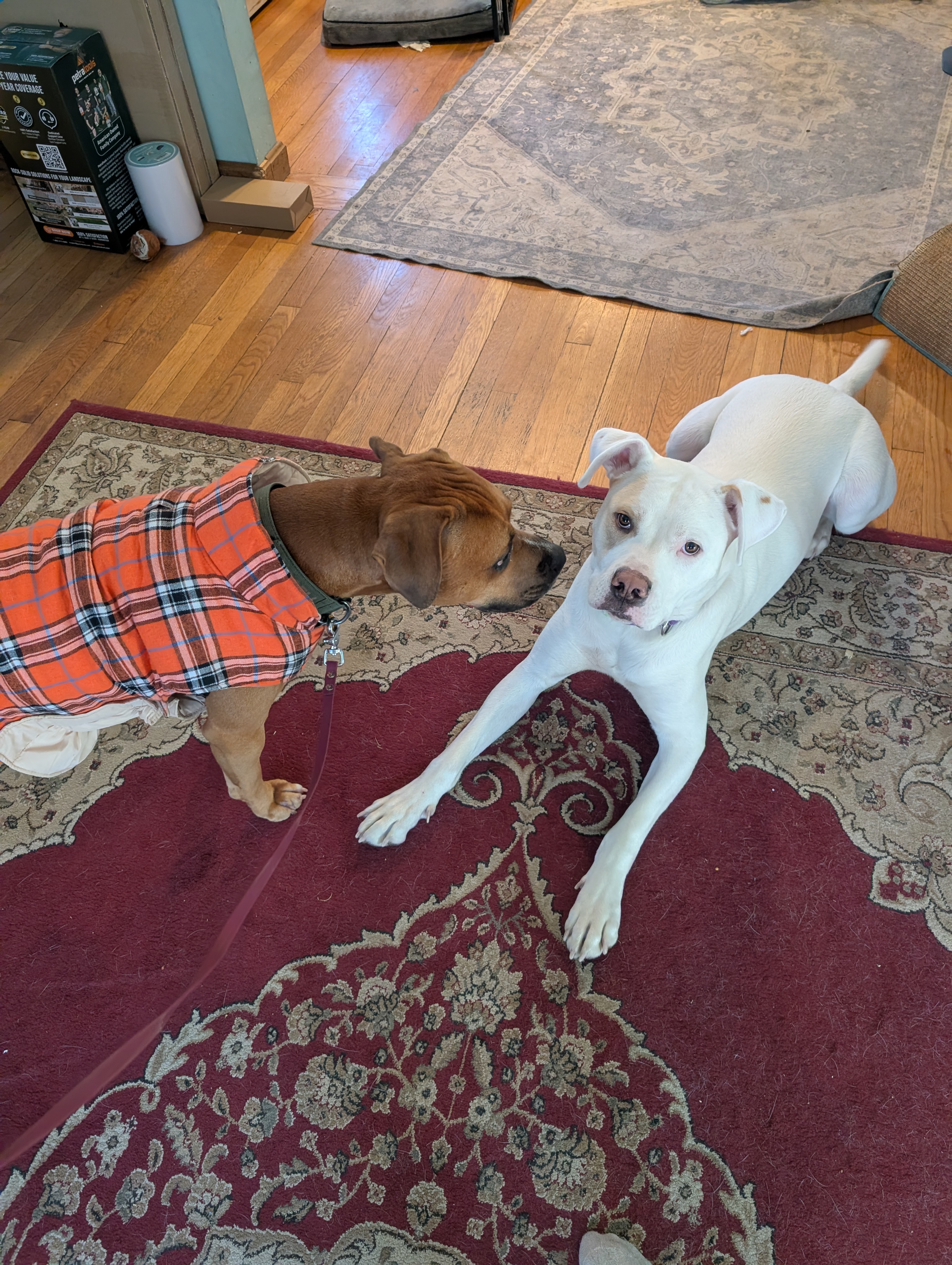As it’s still very chilly today we are keeping outside times a bit shorter. He met 2 more of our dogs, including Xavier, who is our big player. He is also a larger and more energetic dog so one Russell may be less comfortable with. We put Xavier in a down so Russell could feel comfortable, while he was unsure, he did very well!