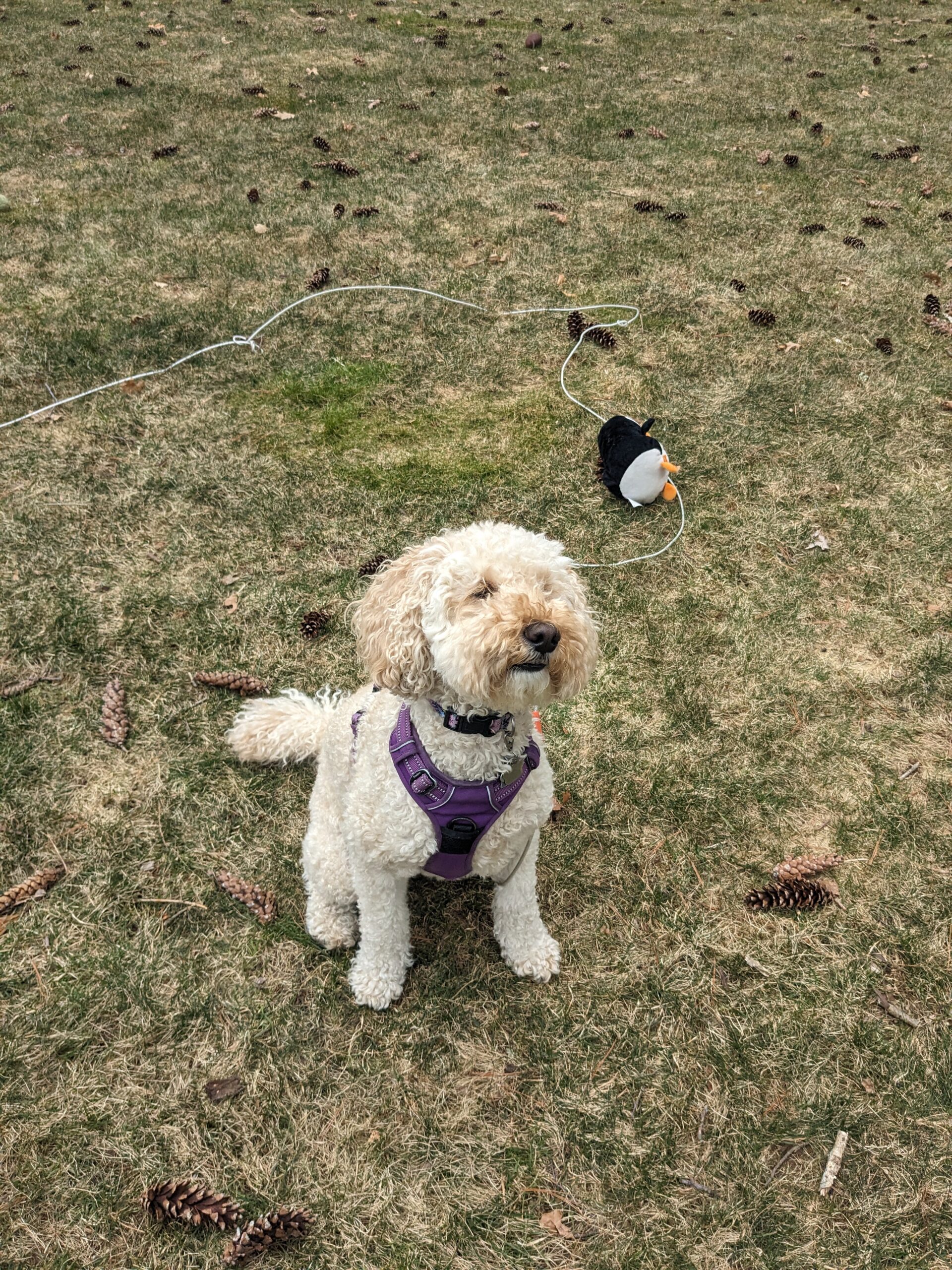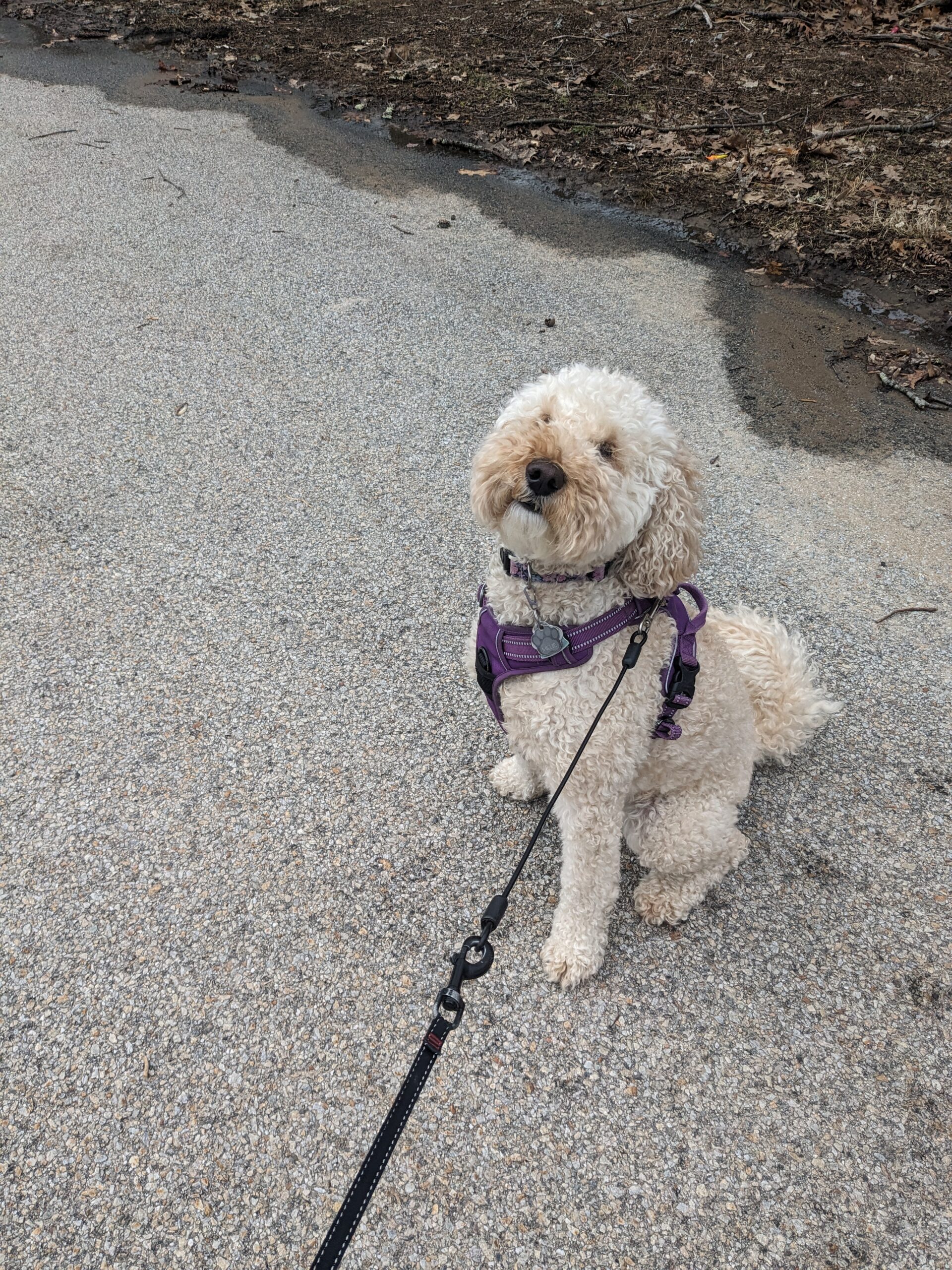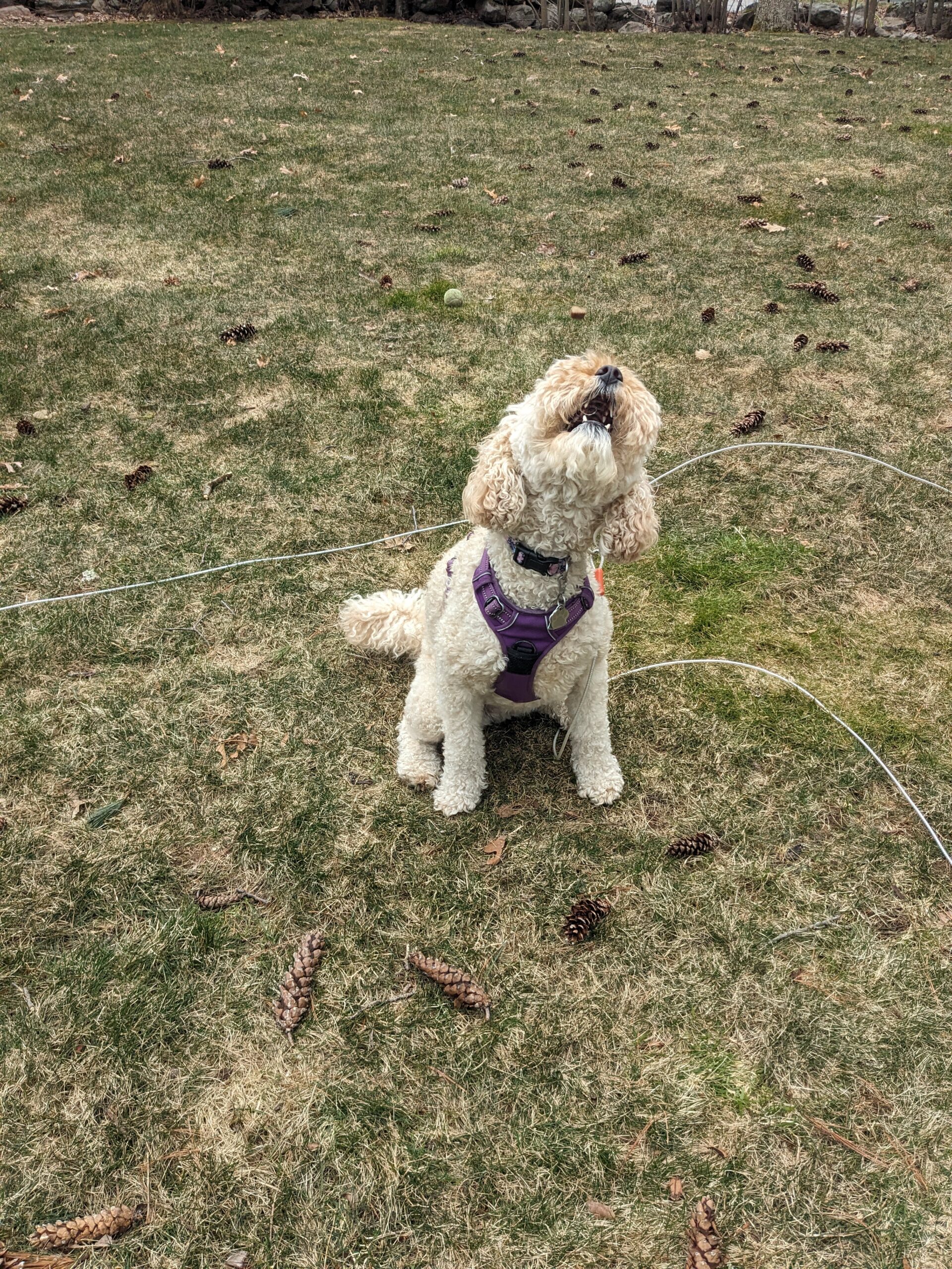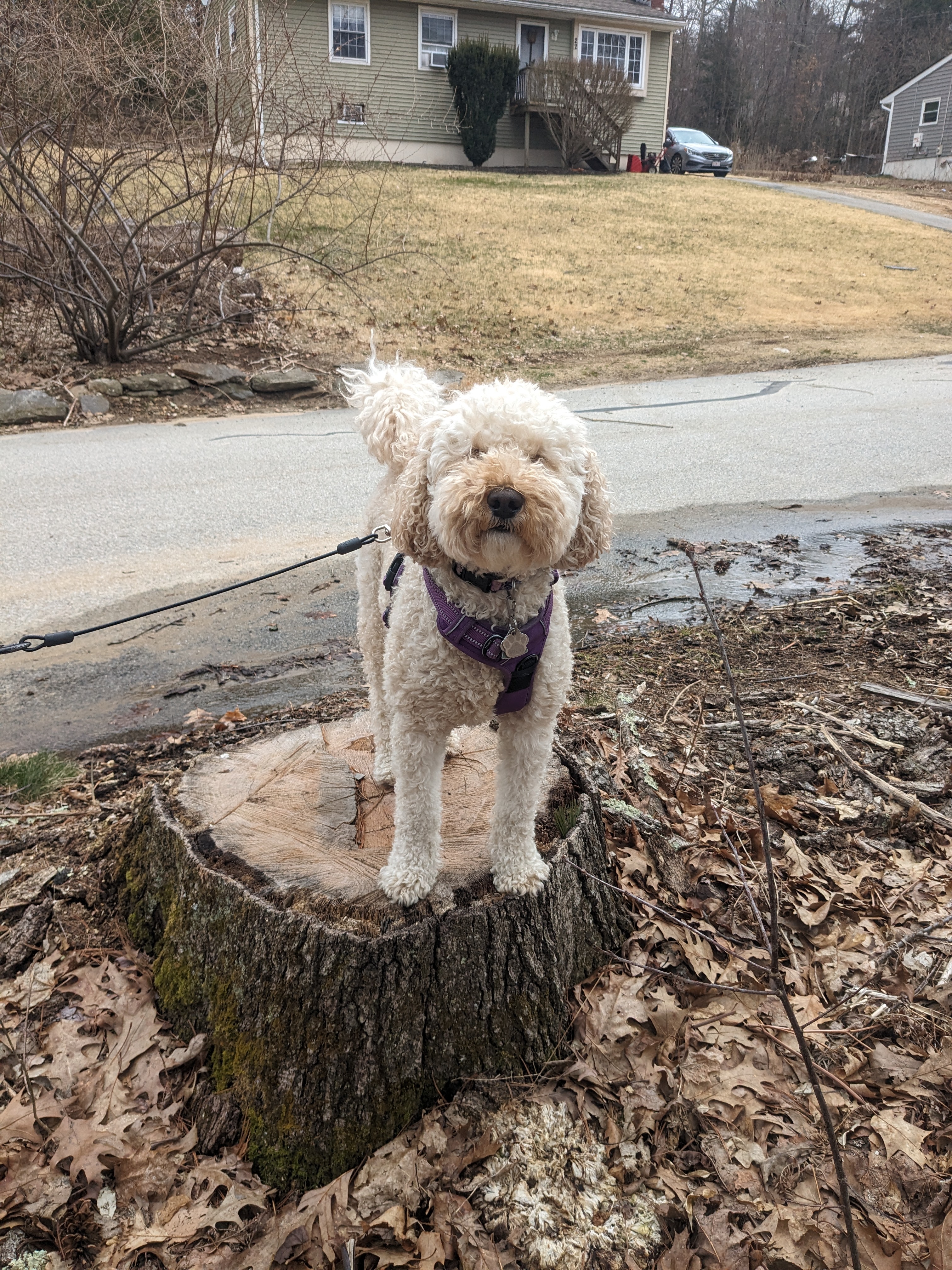 Millie once again was a fluffball of energy, ready to at and run. On our walk as I was picking up her “daily deposit” I felt as though I was being watched.๐ And indeed I was! I turned around to see she had jumped up on a stump but her lead was tangled in some branches so she was kinda stuck on that stump. Of course after a quick giggle I freed her from the pesky branches and off we went to play in the yard. She cracks me up I tell you! ๐๐พ