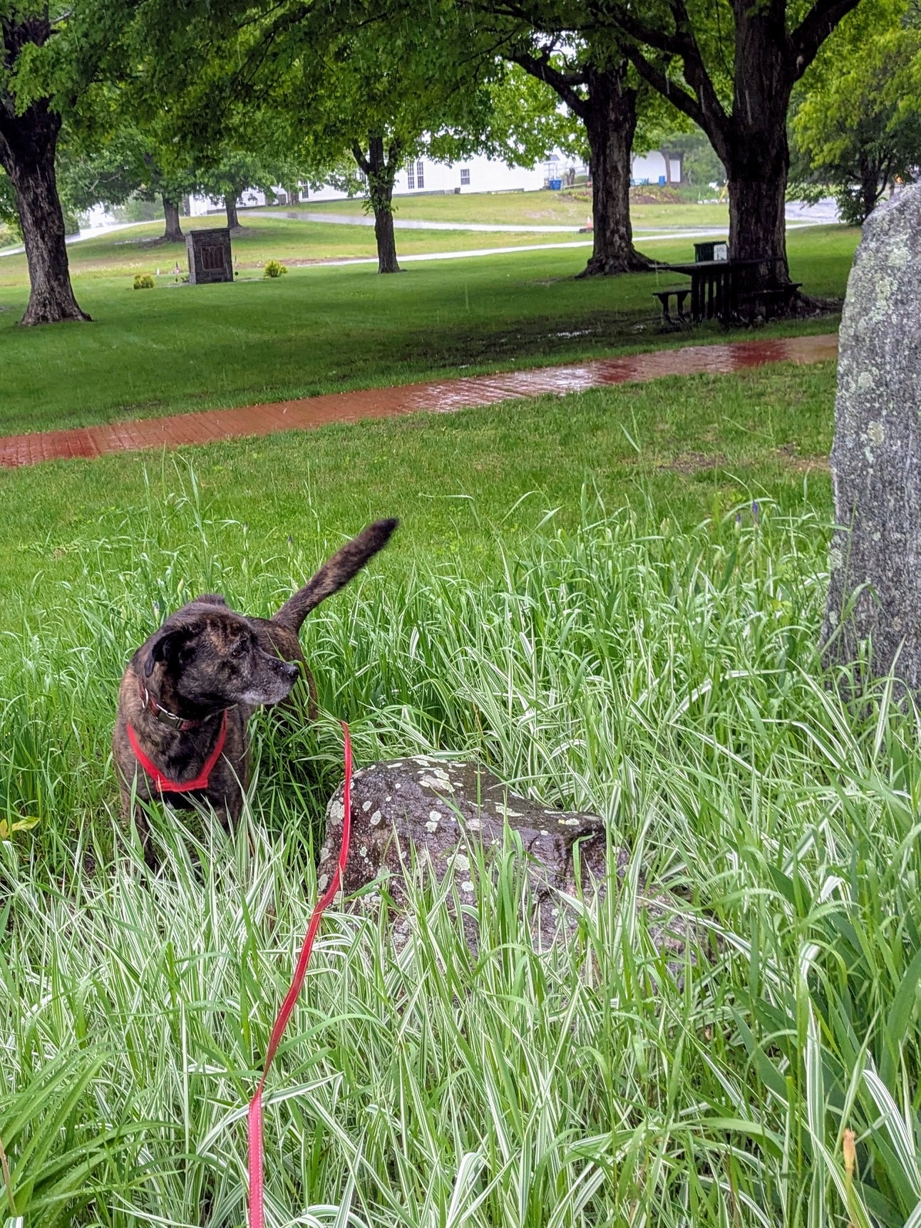 Hi! Neither Moose nor I love the wet or cold ☔ and I figured a short walk around the common would cover it. Moose barely wanted to go far enough to do his business, but then he spotted something in the bushes and spent the next 10 minutes getting soaked, hunting for a varmint. I could tell the critter was long gone, but the scent lingered on the freshly washed leaves and Moose was determined to find the source. Eventually I called off the hunt, and he had to leave empty handed. The sky wept.