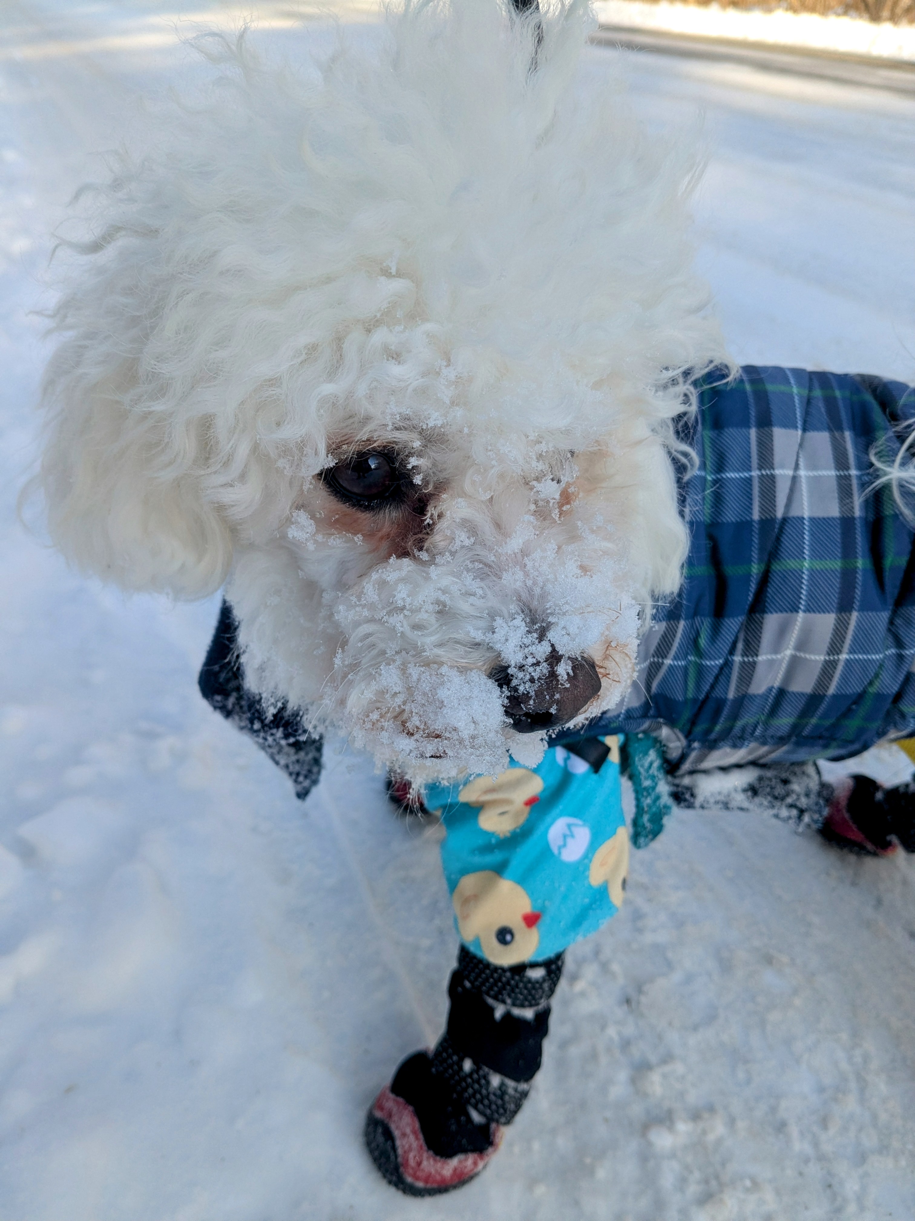 Mylo I were very happy to have a slightly warmer sunshiny day today! He had his little sniffer on overdrive since it was much easier to find all his unread pee-mails. He found a whammy of a scent and basically went ears deep into the snow to read that particular pee-mail! I must have been breaking news! 🤣Just that little tiny amount of thaw made all the difference!! His whole face was snow covered, I couldn’t contain my laughter! 🤣 On our morning walkies we got to say hello to Lincoln, Jonesy’s brother, Mylo a little disappointed that Jonesy wasn’t outside as well. He LOOOVES her! 😍 It was a fun-filled day of sweet Mylo fun as always!