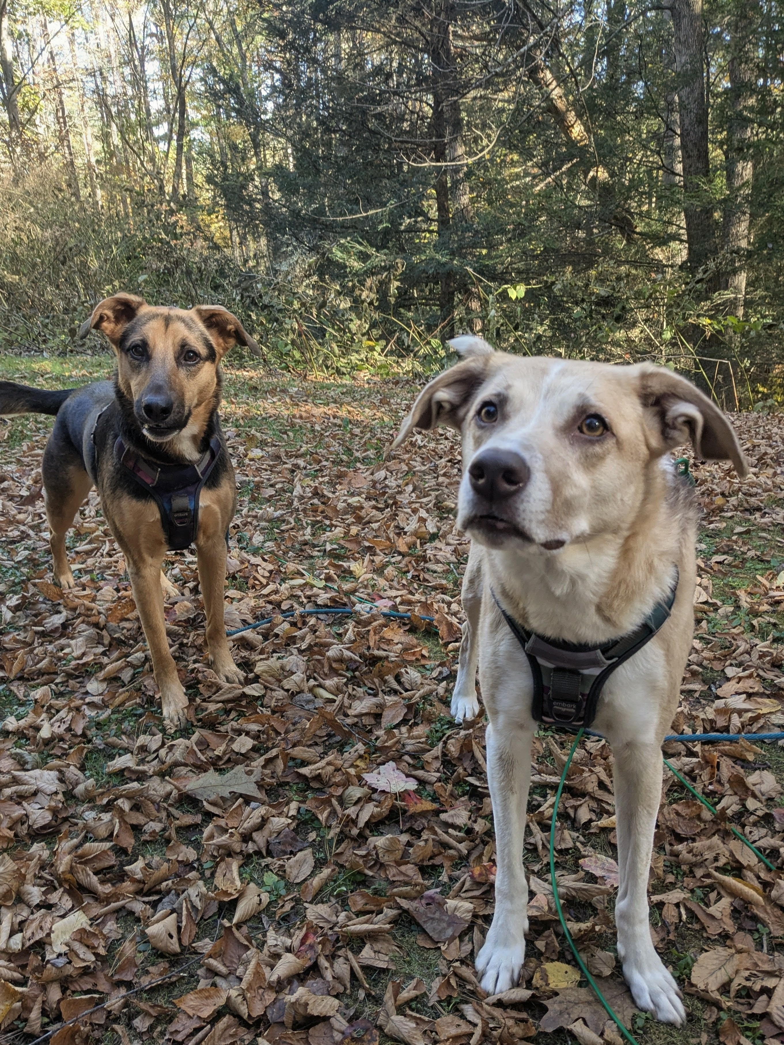 I love when I show up for a visit with the girls! Polly always gives me a great big hug while Fawn can’t hold in her excitement and grabs a ball or toy and zooms around the house for a few mins. Once they settled we got geared up to play outside! They both have their favorite things to do while we our outside. Who needs balls or toys outside when we have endless branches and sticks to chew! Polly found her favorite branch to play and chew on along the creek while Fawn and I sniffed around and played tug o war with a branch or two. Then we had a treat scavenger hunt! Their favorite game! We also looked for creepy crawler and critters under the leaves and brush! Endless things to keep our brains busy! It’s always so much fun!
