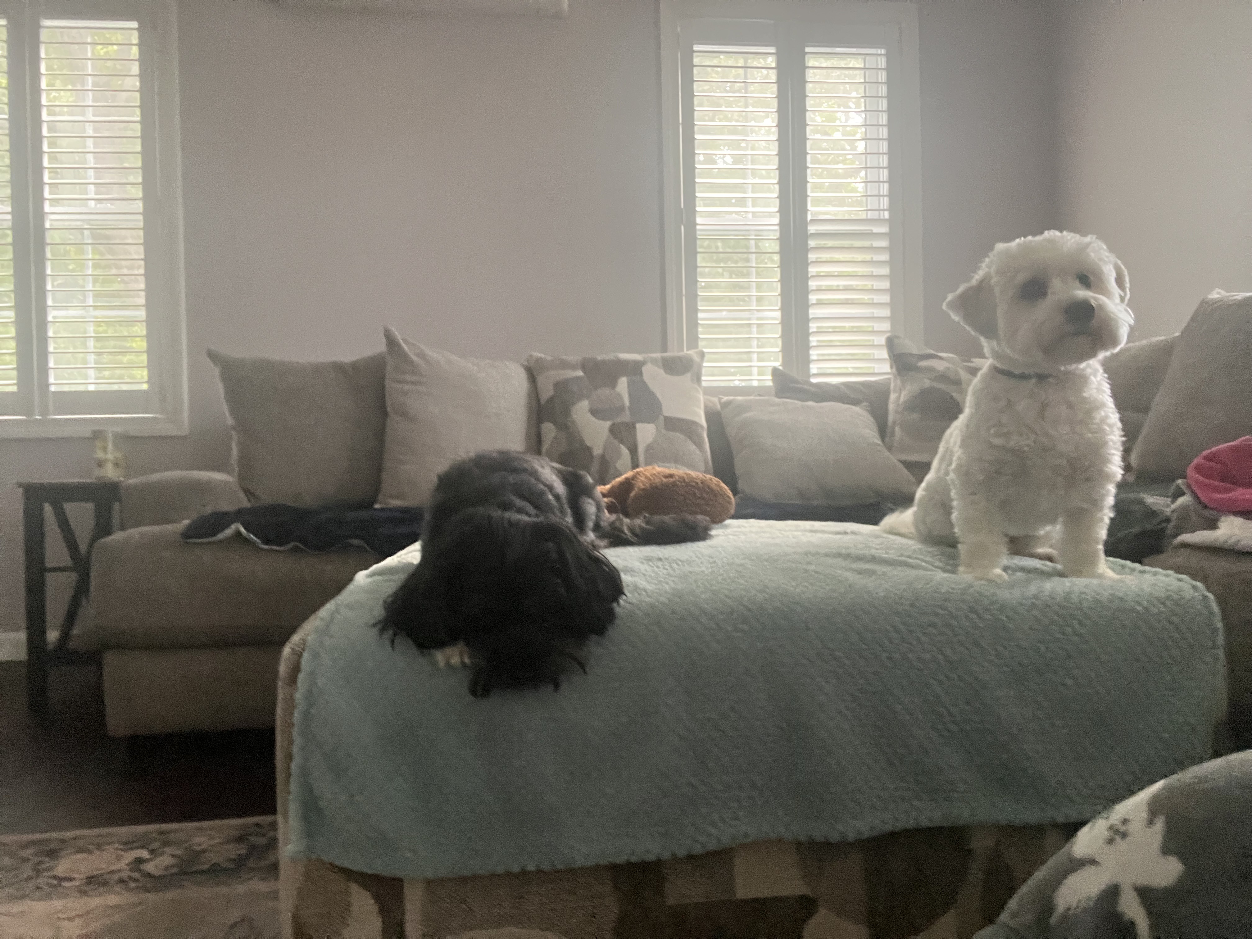 Every visit I wonder if this is the one that Nova will choose to go outside with us. Though it didn’t happen today , Dezi is peeing outside when we go out. They are continuing to eat all their meals and enjoy their treats. Only mischief that I noticed was the corner of the rug pulled back and the rubber part chewed up a little bit. The good thing is it didn’t look it was ingested since it was like a scavenger hunt to find the missing pieces. I ended up folding the rug under and putting your slippers on top of it. Hopefully the smarty paws leave it be. Besides that they seem to be content.