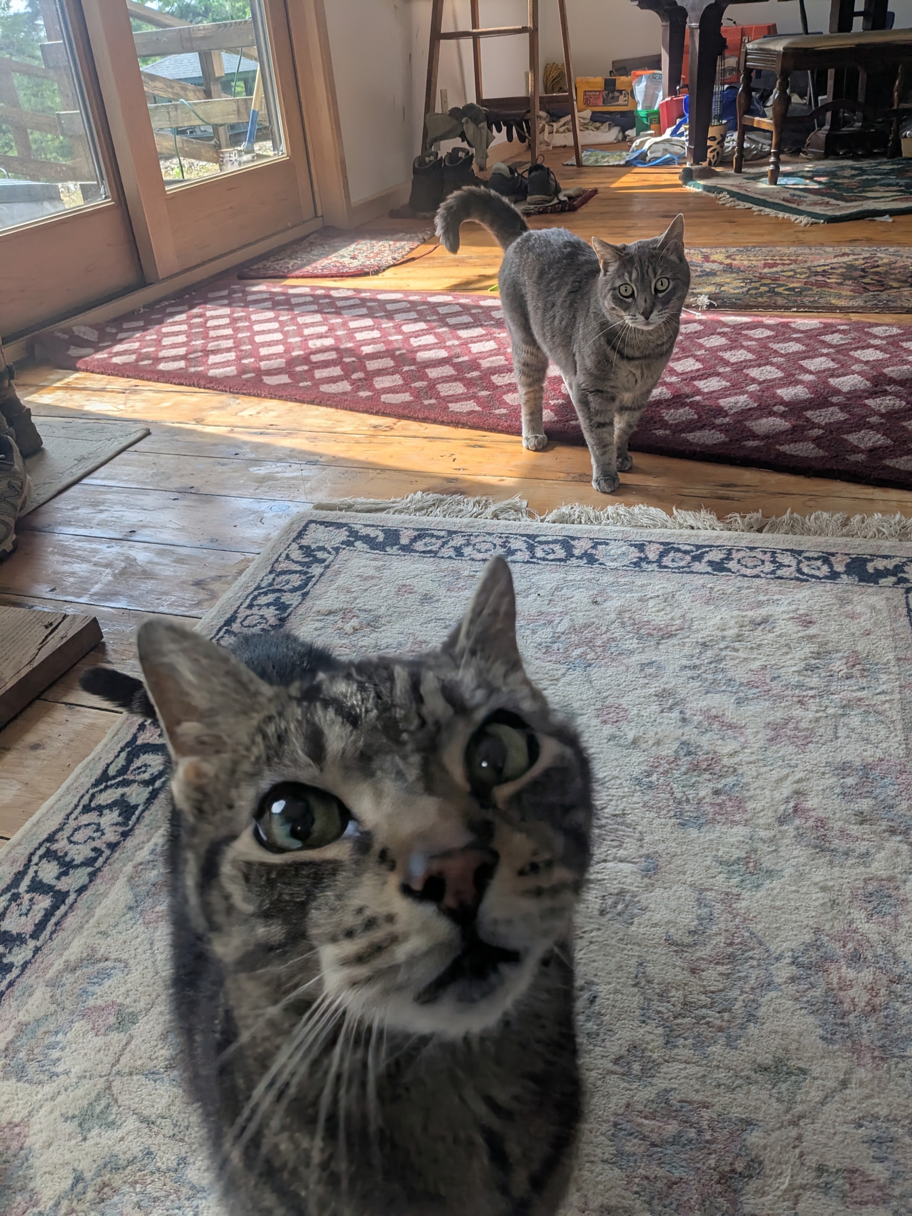 Graycie and Jack were full of energy this morning! After breakfast Graycie got the zoomies and was racing around the house like a mad kitty!😸At one point Graycie pounced on Jack, but Jack wasn’t having it and let her know that he was not in the mood to wrestle. She back off and we then had fun chasing treats and playing with their paper bag and with the cherry wand. Jack was the perfect gentleman and was very polite about asking for more treats and his patience for wild and zoomie faced Graycie! 😸. These two are absolutely adorable!!!