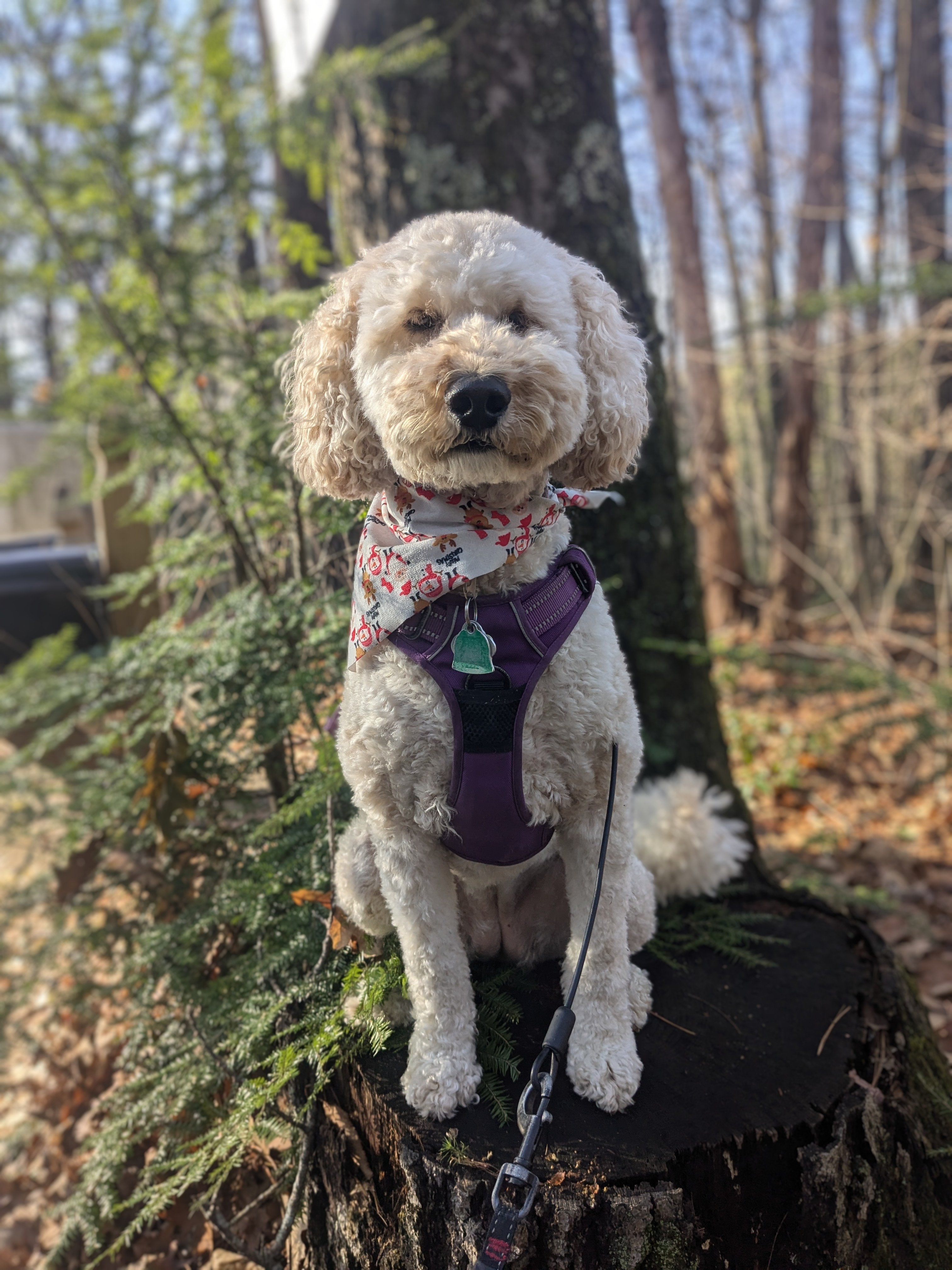 Oh Millie looked so pretty all groomed and ready for Christmas! He Christmas bandana was so darn cute! But don’t let her exterior fool you, Millie is no girlie girl, nope! Once we were outside, she was climbing rocks, tree stumps, more rocks and pouncing in the leaves like a girl who doesn’t mind getting her paws dirty! Thankfully with all her shenanigans, she came home still squeaky clean(ish) 😁😅