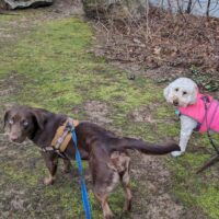 The rain has slowed but still a soggy walk for Millie, Myself and her BFF Elsa. They had fun splashing in puddles and sniffing all the good spots. They played chase and enjoyed chomping sticks together even the soggy one.😂 Millie and Elsa met a week ago and became the best of friends. 🐶❤️🐶 Elsa heads home tomorrow to be with her family Millie and Elsa we’re a little sad to say goodbye. I reassured Millie that it’s more like see you later! They will definitely see each other again.