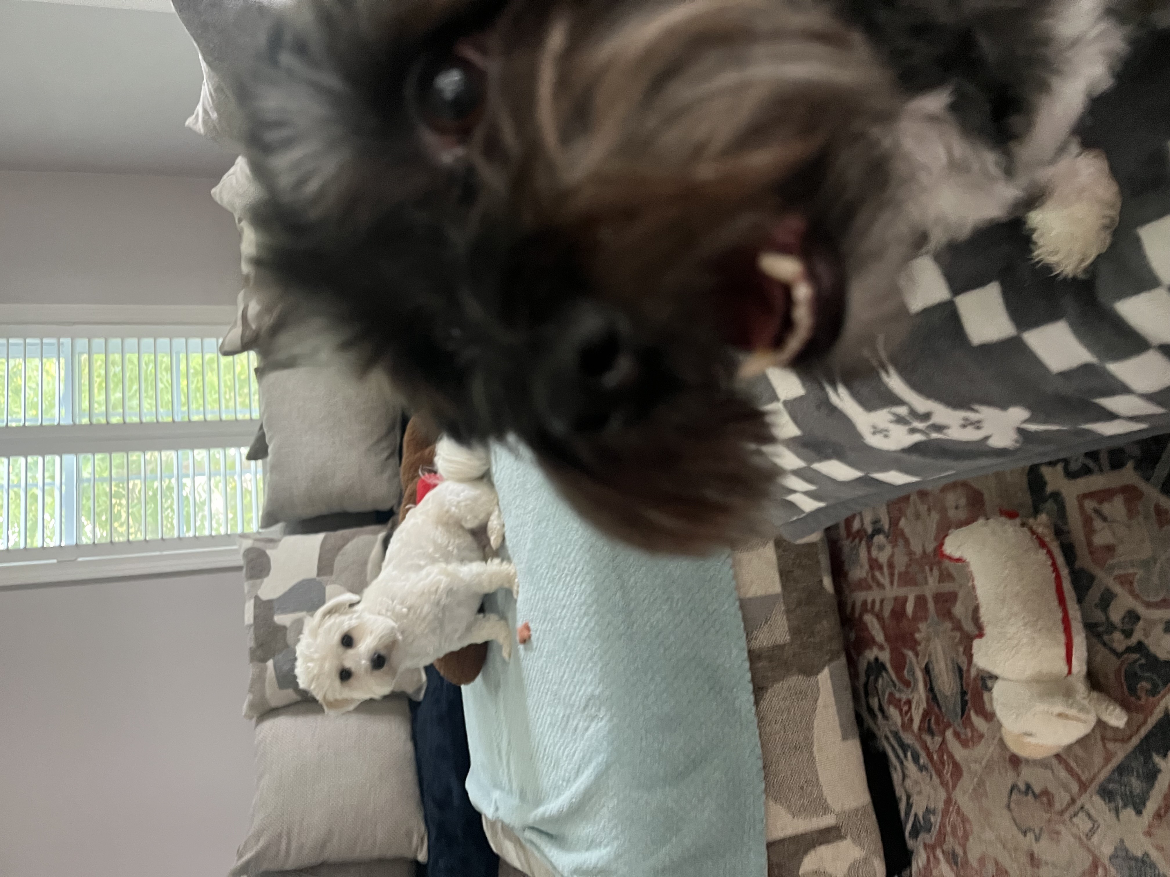 After 10-15 minutes of her observing me petting , snuggling, massaging Dezi ; she ended up jumping over and going on my back .