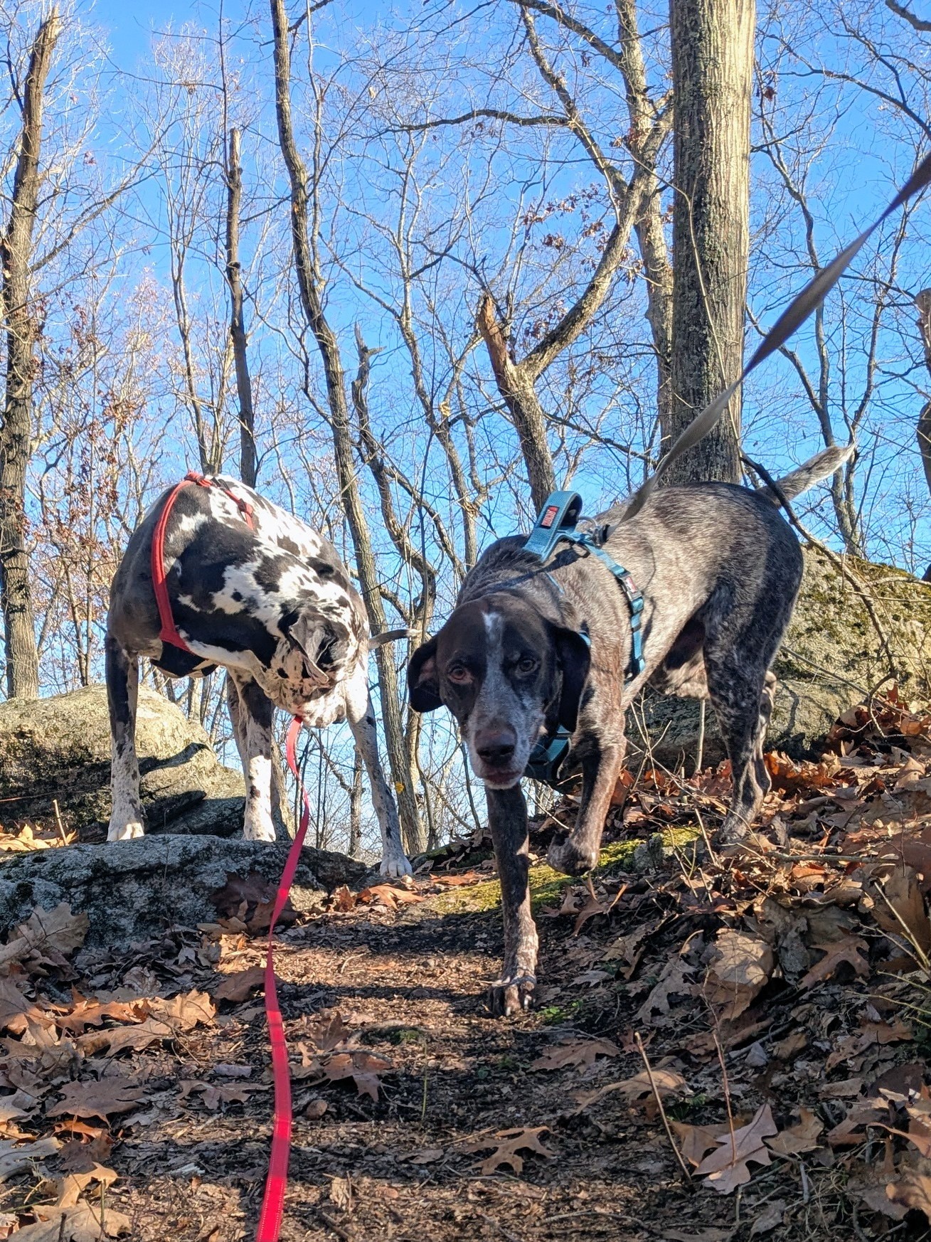 Getting together with the Gus gang for lunch was like seeing pals from grade school. It was like we had been friends forever – even new pet pro Kristen! They listened so well, took no time to get leashed and harnessed and we were ready to go. With tons of paving and construction on the street we opted for the trails across the street. Jada took a minute to get used to not biting at the long leash but otherwise the 3 were glad to be out and we’re happy just to be dogs outside. Gus showed how he pulls after a 🐿️ and it was no problem, Jake was fine as long as Gus wasn’t ahead of him, and Jada wanted to be everywhere at once. Walking single file was a challenge and they aced it!