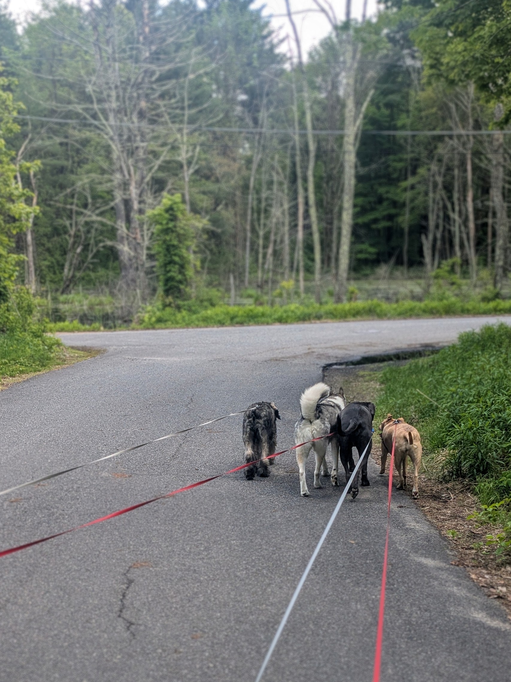 Everyone was excited to see newcomer Jasper show up for Social Club again, especially Lucy! 😍 We wanted to get a shot of them greeting each other but they were such a whirlwind we could barely keep from getting tangled in their leashes. 😂 Packer and Oliver rolled their eyes at the puppies – they’re way too cool now, and they headed right across the street to the Common. Walking 4 dogs each on a 25′ leash requires a sort of ballet of both dogs and walker to keep the lines straight. These 4 stuck together so closely it was they were practically on one leash 😂 The highlight of the walk came at the end, when the gang encountered a giant swan enjoying the sunshine close to shore. Oliver cowered, Lucy just about jumped in the water, while Jasper stood there bewildered watching the whole scene, unsure what to do. Meanwhile Packer barely gave it a glance. He was so into the sweet grass, that seemed to be what he was all about today. The pack danced all the way home, already telling tall tales of their encounter. Oh to be a dog! 🥰