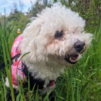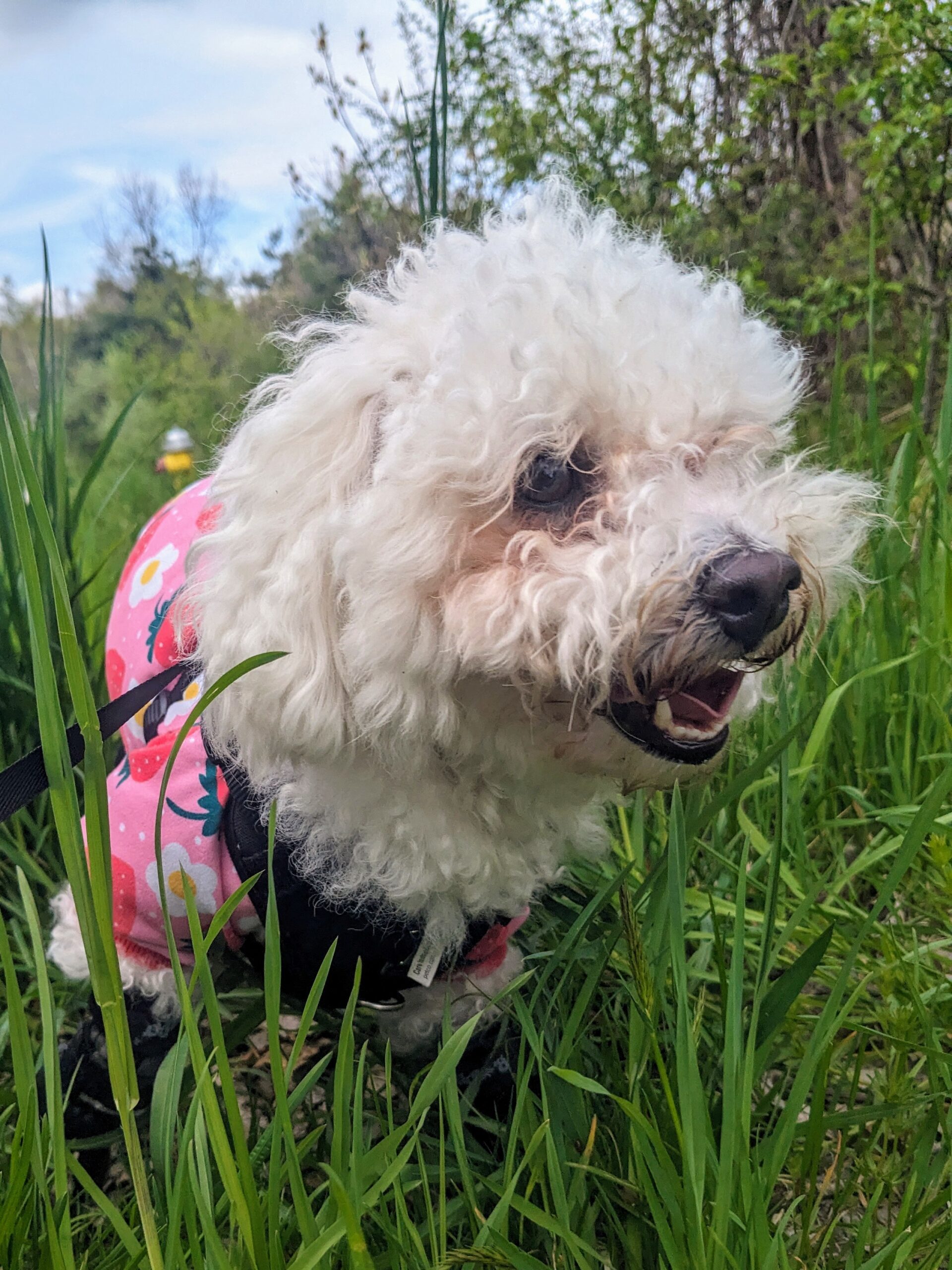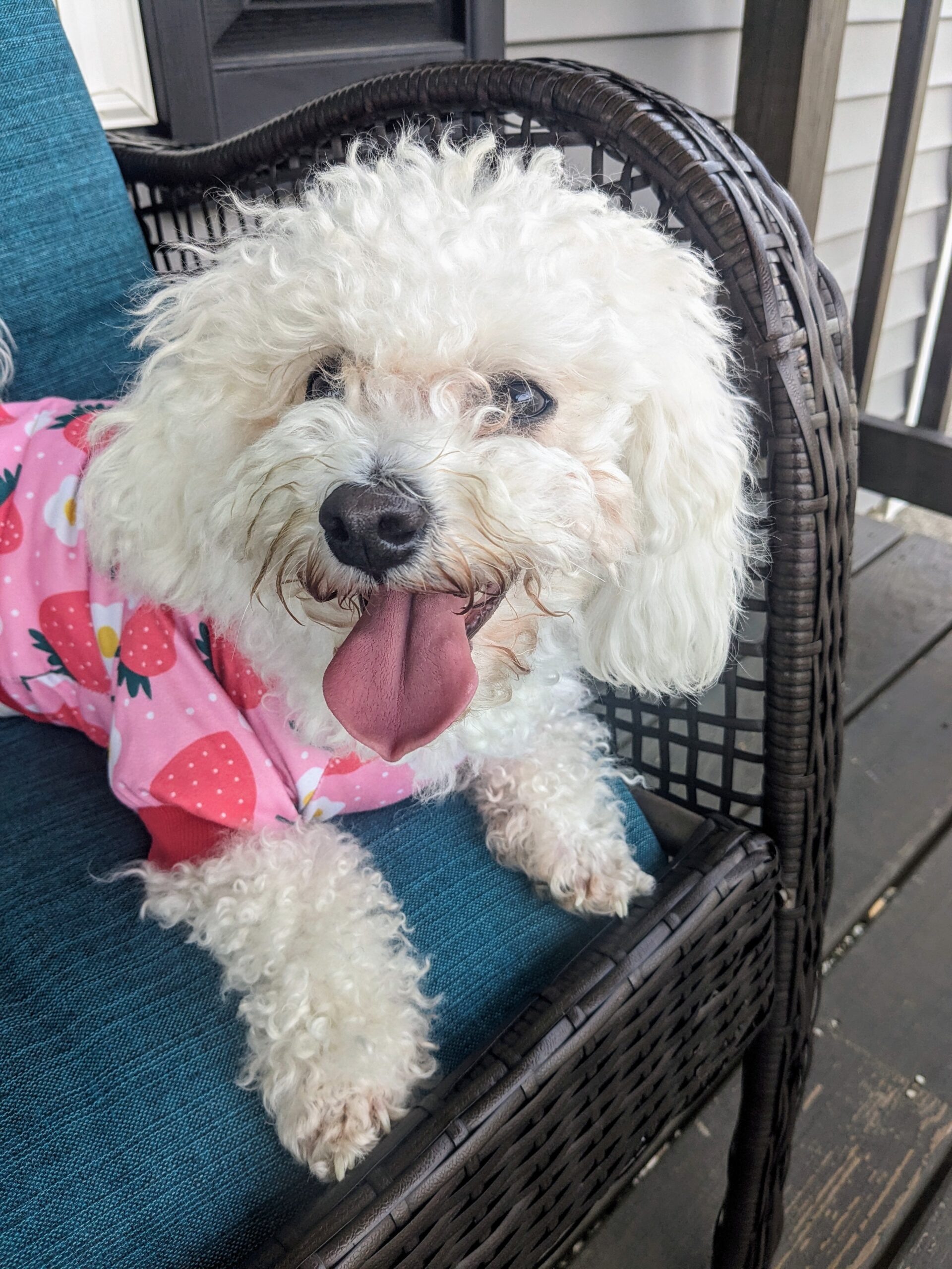 What a special treat seeing Mylo today! He looked absolutely adorable in his 🍓🍓 jammies. He greeted me with cute squeaks and oh so many kisses! My heart is so full! Our walk was full of sillies and smiles. We got to say hello to Cooper the Yorkie and waved to Jonesy as we passed by. There was lots to sniff and of course a few stinky spots to roll in.🤦 When we got back home he plopped on the porch seat and watched folks walk by and enjoyed the sunshine for a few. My oh Mylo is so cute! ❤️🐾❤️🐾