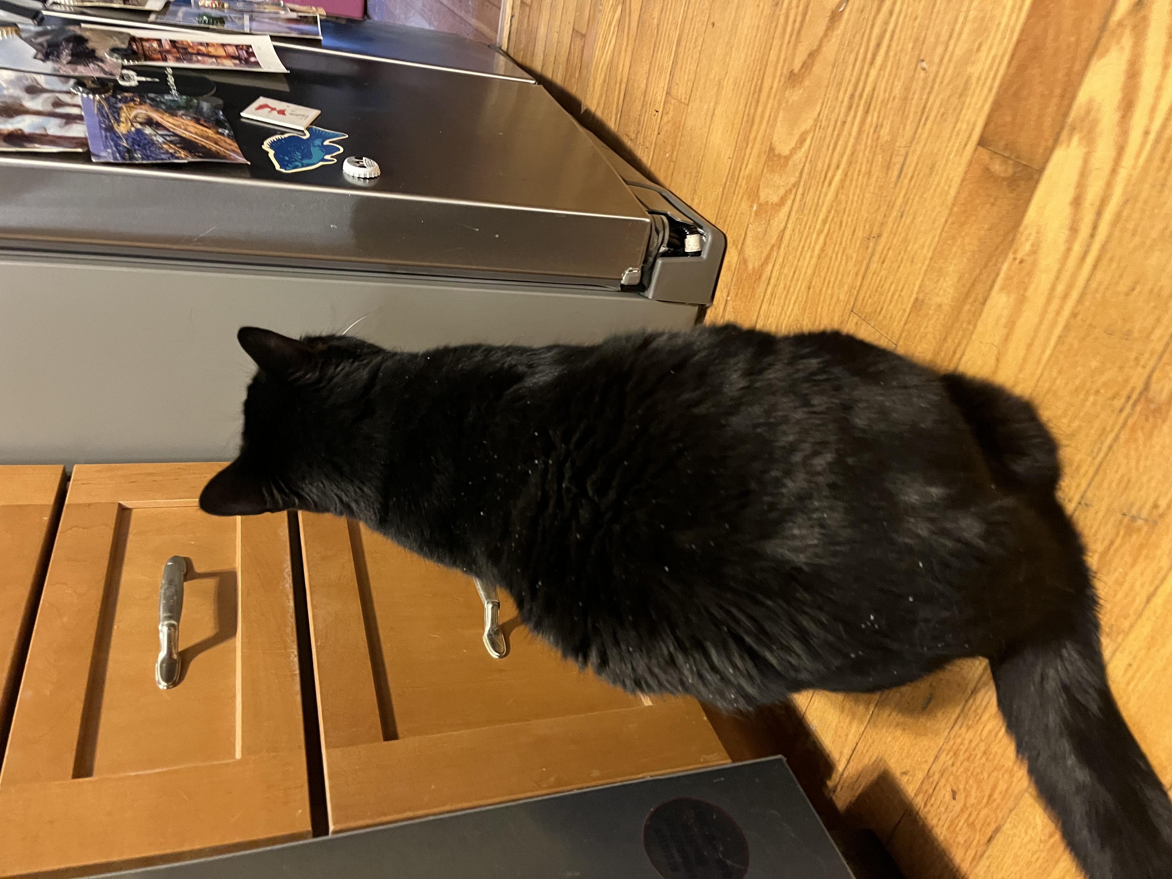 Cash was really trying to get more food out of me by brushing against the fridge . Then I he turned his back and sat there almost like he was take a stand 😹 eventually he came over for his pet and play time. He curled up in his box before I tucked him in for the night 🥰🐾