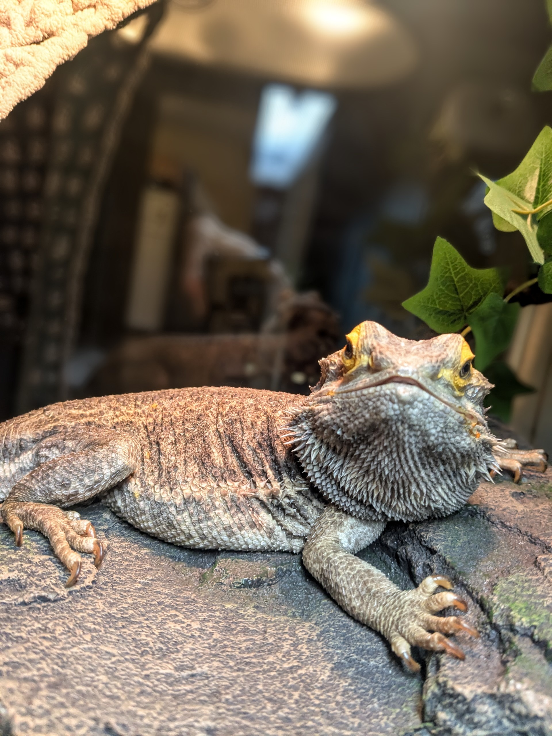 The bearded dragon Lizzie was very relaxed as I dropped her arugula in her lair, but she eyed me suspiciously when I snapped a photo. Dragons are known for their vanity, so she just wanted to make sure I get her good side! 😂 Pepper in the meantime lounged on the couch, her mane making her look puffy and giant. She graciously accepted lots of brushing, but sneered and yawned when I offered toys. Littlefoot slept so cozy in his cave I didn’t dream of disturbing his highness. But maybe tomorrow… 🥰