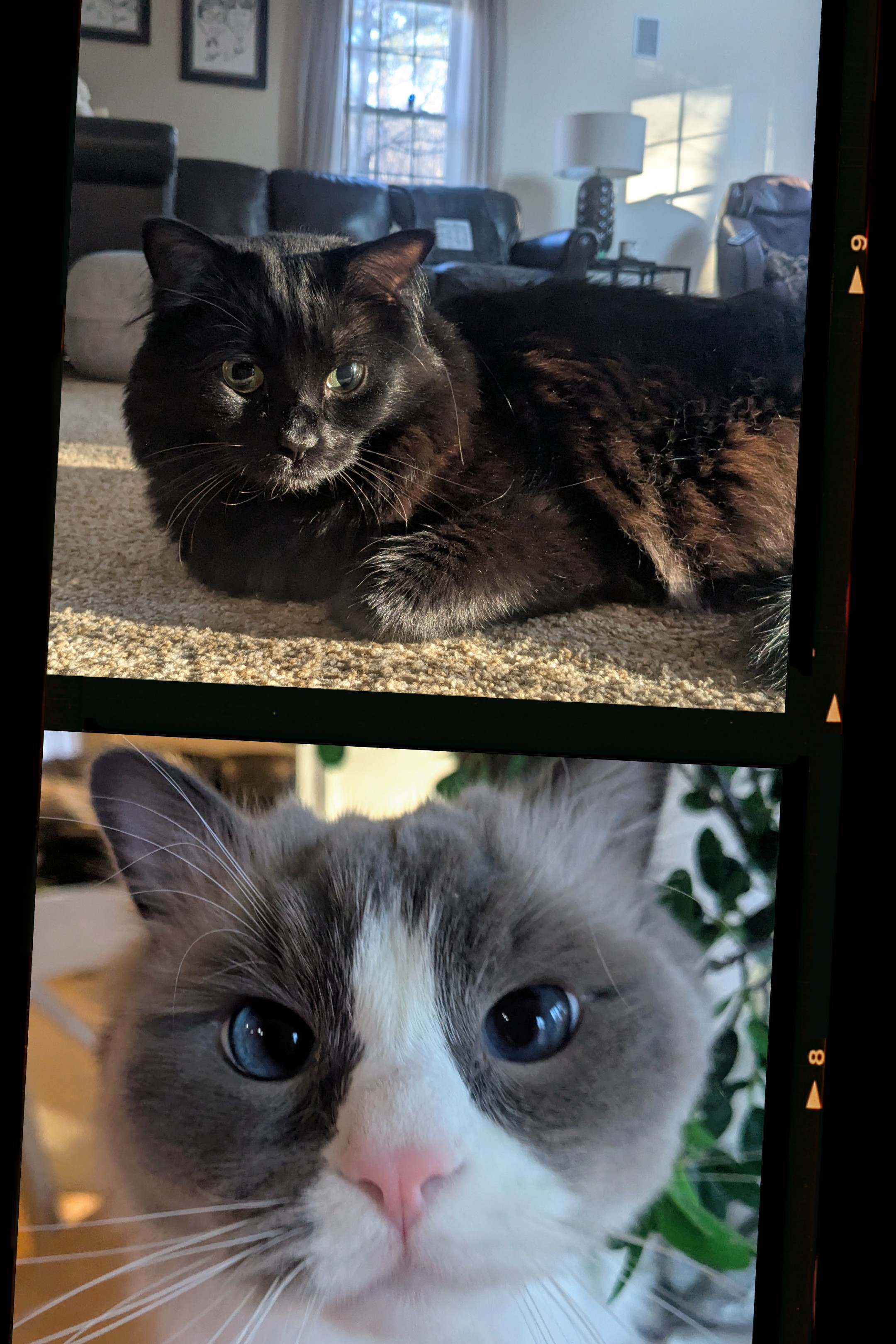The boys gave me such a sweet welcome this morning! Toby of course greeted me at the door with a 2 legged head boop and then escorted me into the kitchen where I said hello to Elvis who was enjoying a little spot of sunshine beaming through the window. As I was petting Elvis, Toby decided that he too needed more attention and proceeded to plop at my feet! Who needs fuzzy slippers when you can wear floofy Tobys? 🤣. We had fun with bubbles and then pur request from Flying Elvis, we played with their feather wand. Toby played for a little while with it but Elvis was the one soaring through the air and being extra silly. Toby instead ask me to brush him all the while playing with Elvis! It was a tricky 2 handed task but they both got what they wanted! 🤣. These kitties have me wrapped around their little fingers ( I mean paws) and they know it! 😻☺️
