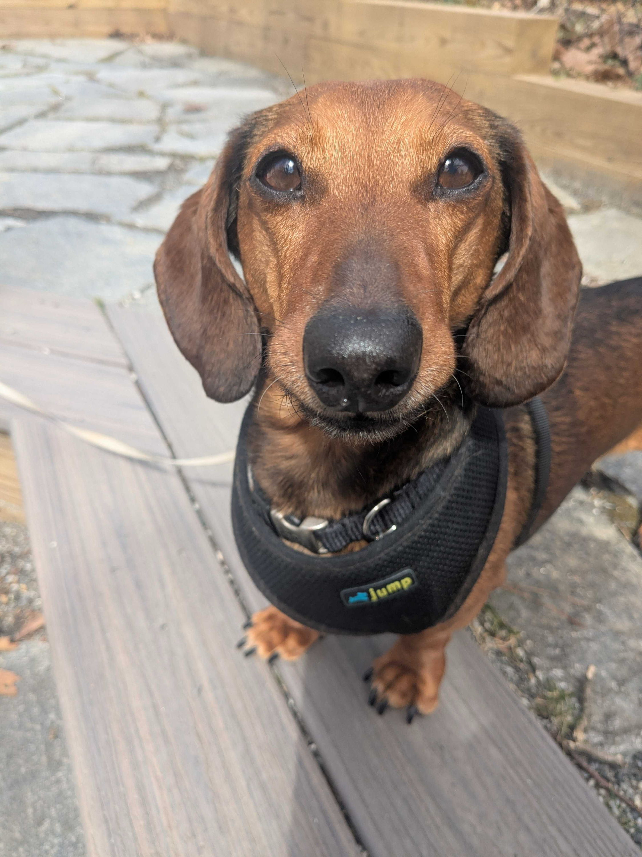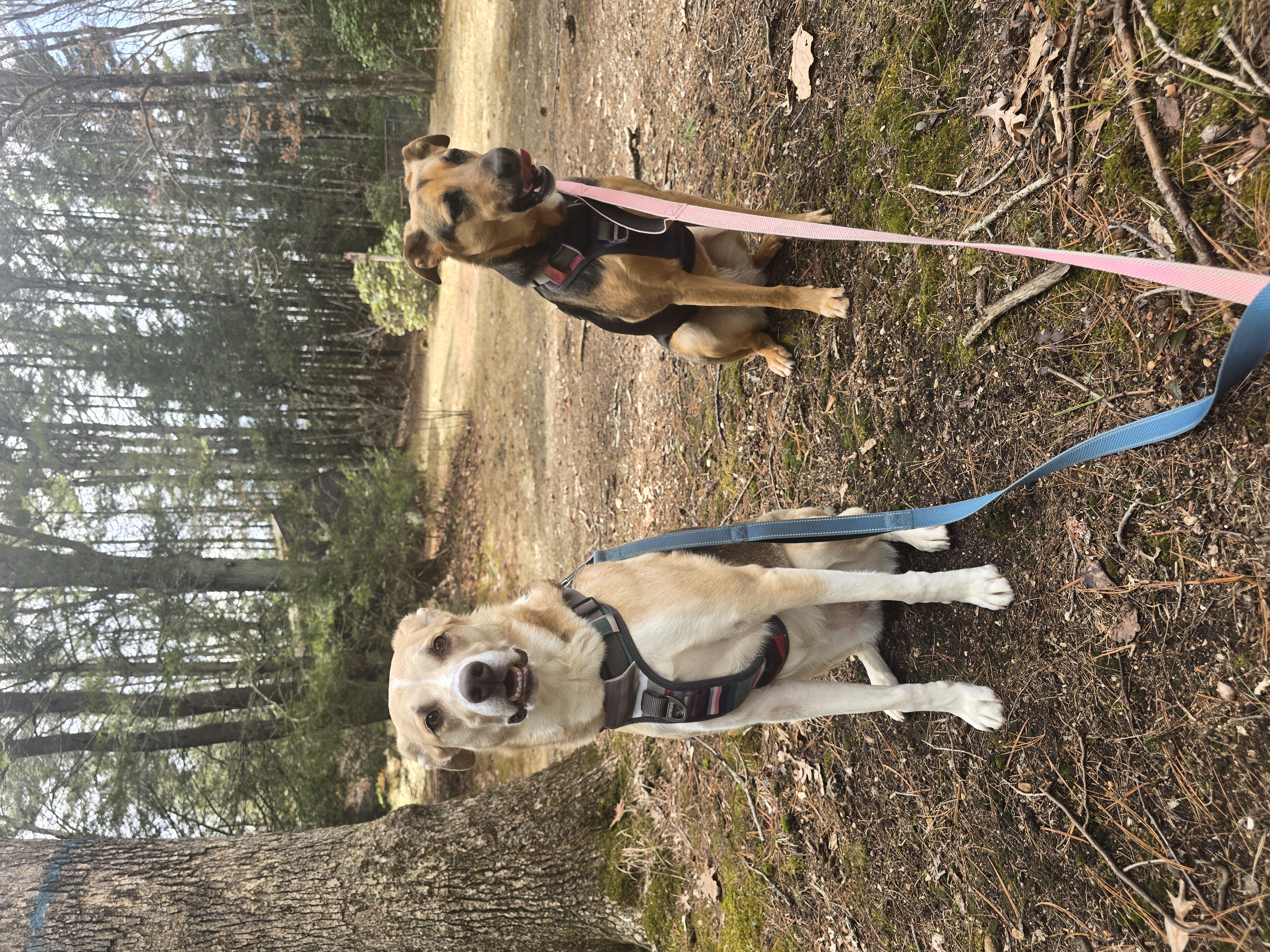 ... more ...💜🩷🧡Fawn, Polly and I took a quick stroll (pull) 😆 through the open woods, crunching and kicking up leaves, taking in new spring smells. 🌷Then we relaxed in the back yard, chomping sticks, investigating, breathing in the beautiful fresh air,…