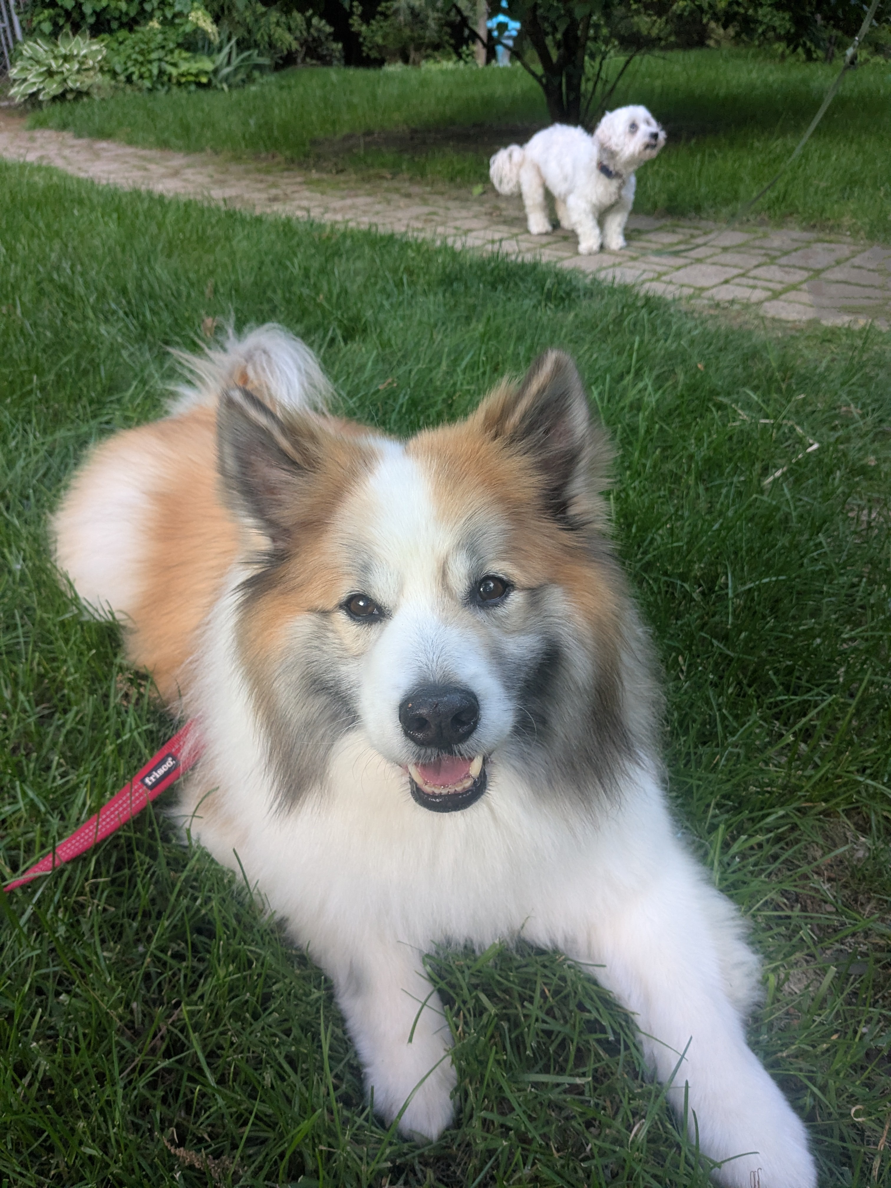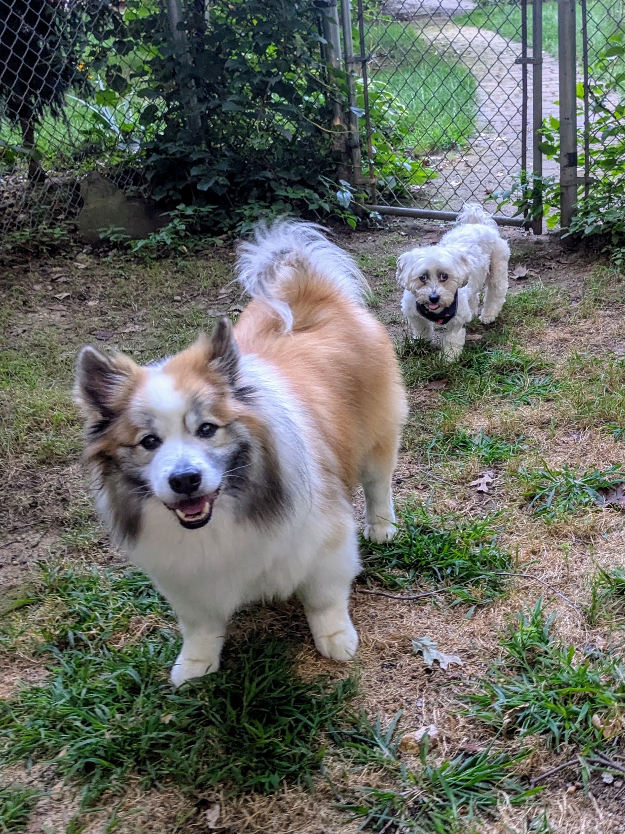 These two wonderful kids did so good on there dinner visit. They enjoyed some chicken for an after dinner snack! They hung out in the yard Miley stuck close to me for all the pets she could get! Bassi barked