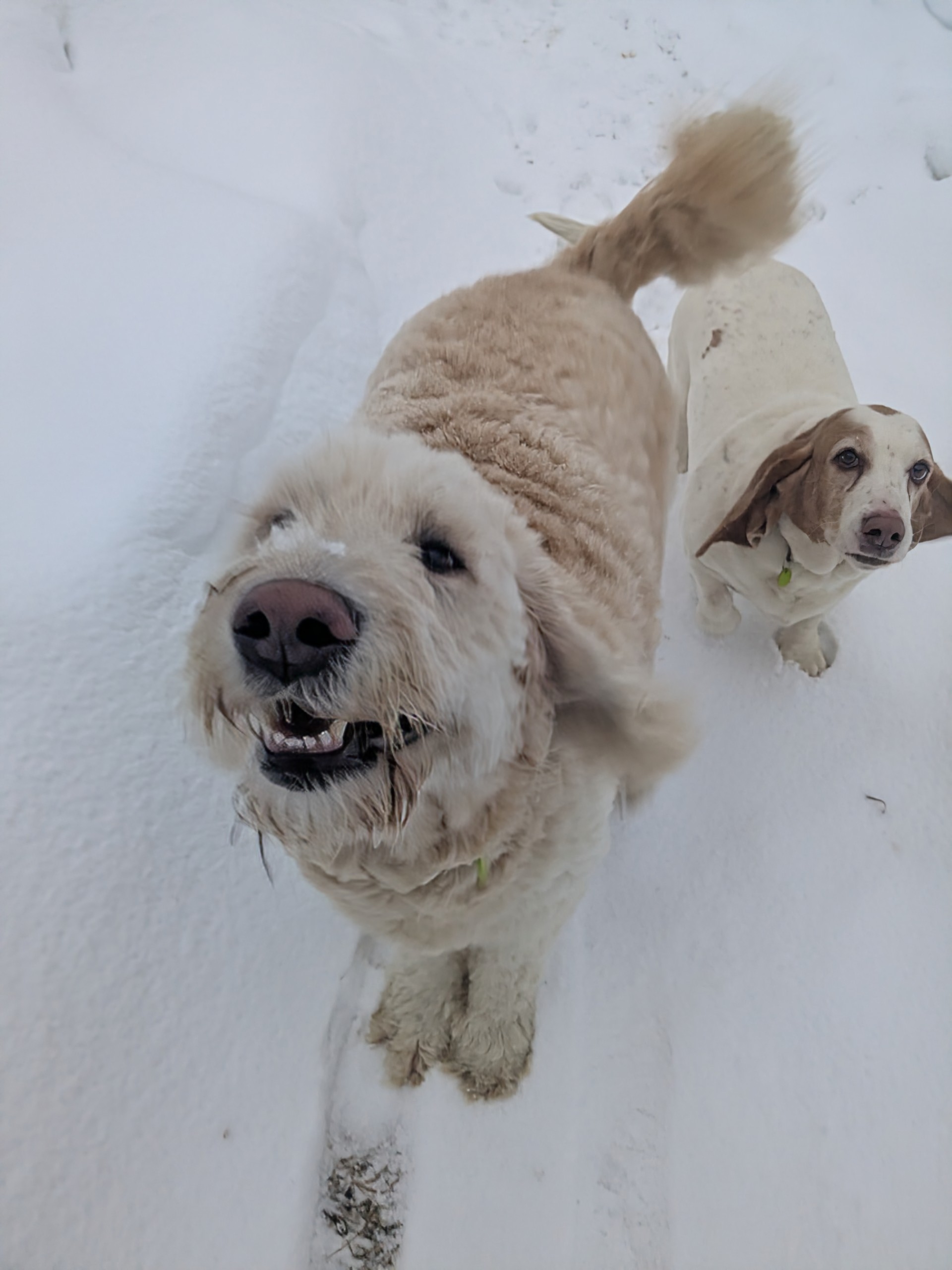 No sleet or snow would stop these two pups from having a great time a fun time outside. Franchy made snow angels while Layla and I played scavenger hunt for treat! The barn furiends were happy to have their dinner
