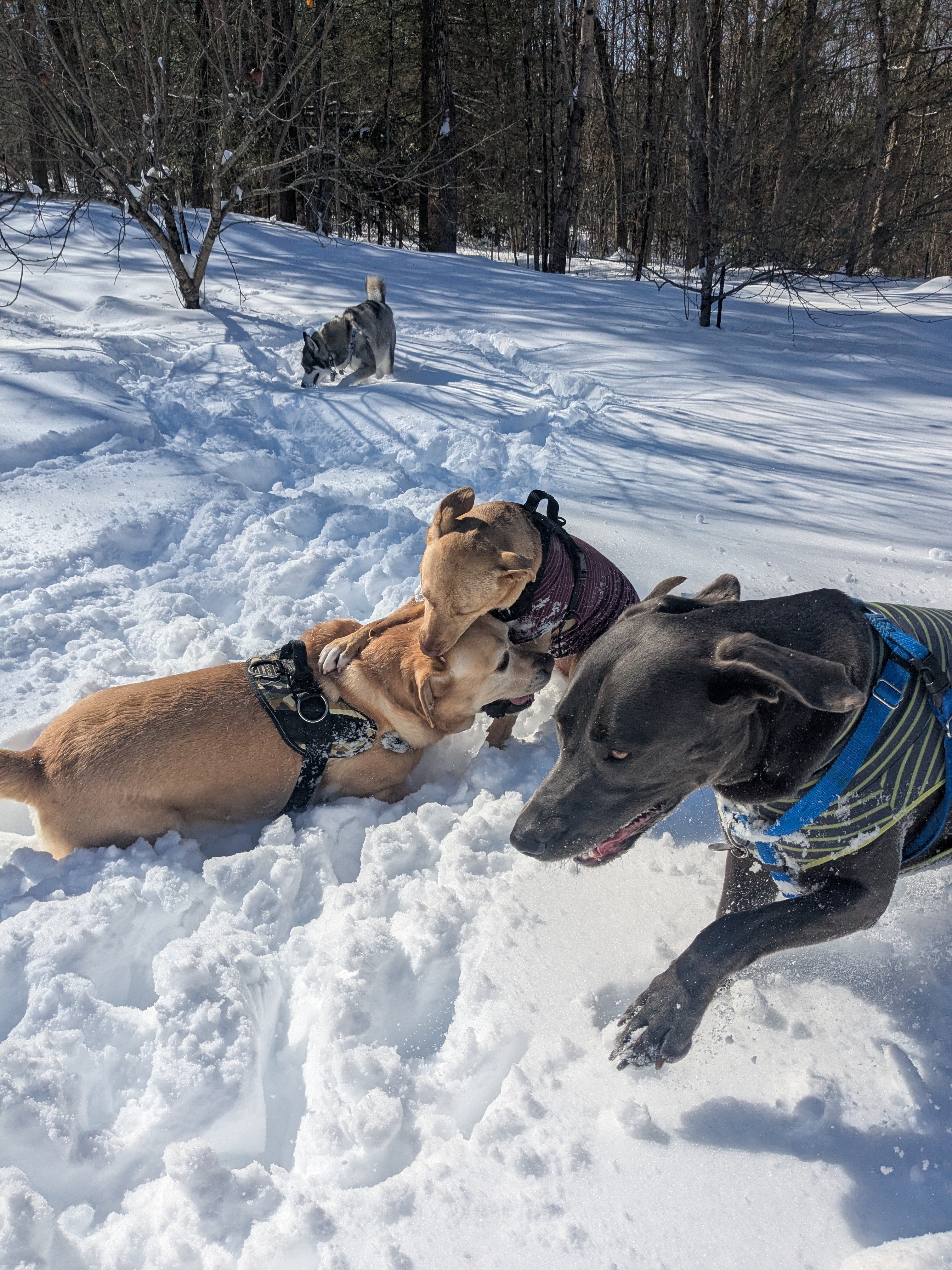 Tucker the happy little bulldozer 👷♂️ Plowed his face through ice and snow covered ground ❄️🧊 Such a goofball 😄 Met new friend Amber 🧡 & even an eager furry neighbor walked over to ‘sniff’ a hello 👋 Slipping and