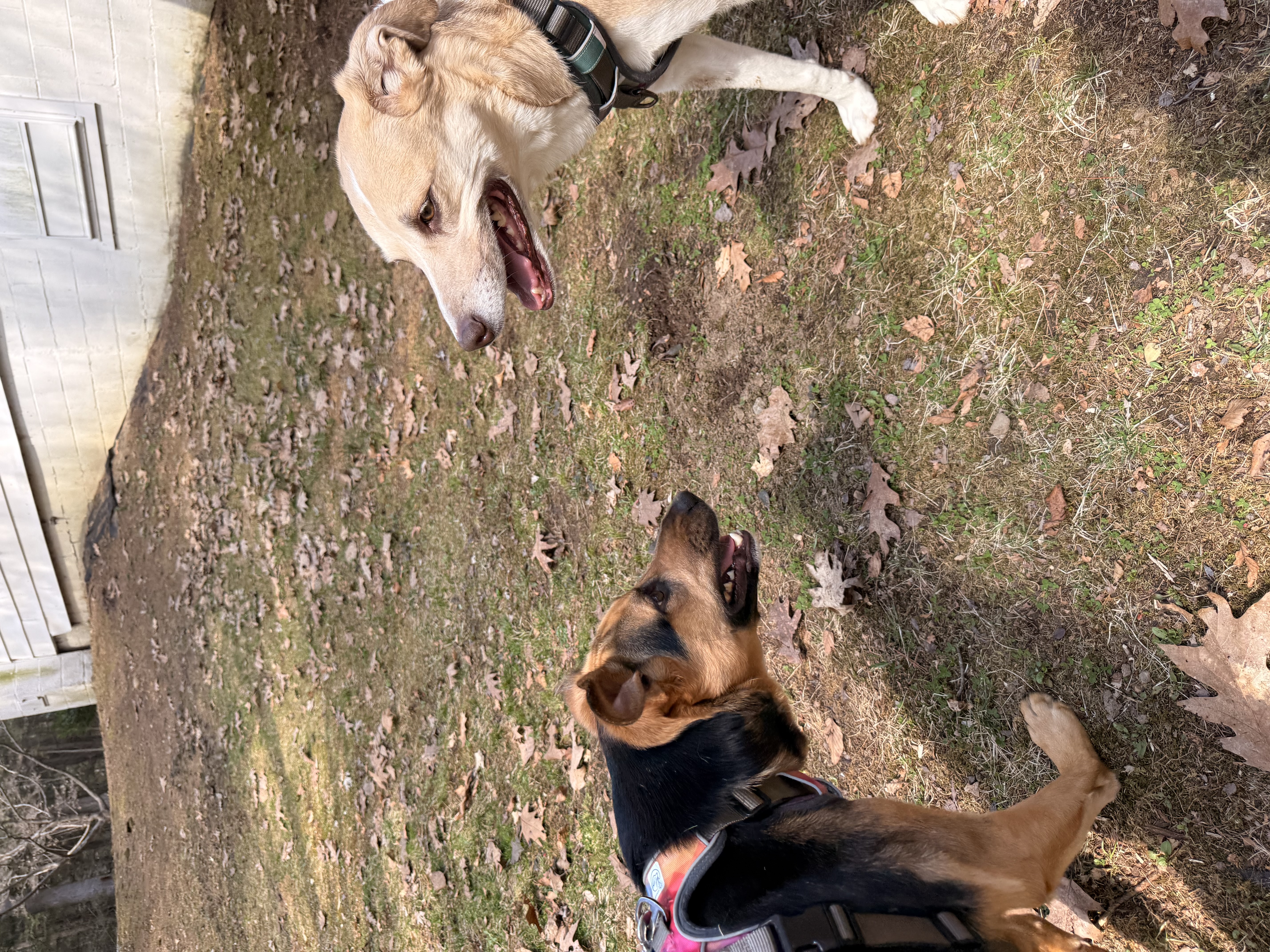 Fawn and Polly are very excited and hyper and want to run around and play all the way until we get into the backyard then they decide they would rather hang out maybe lay down and enjoy the weather. They’ll
